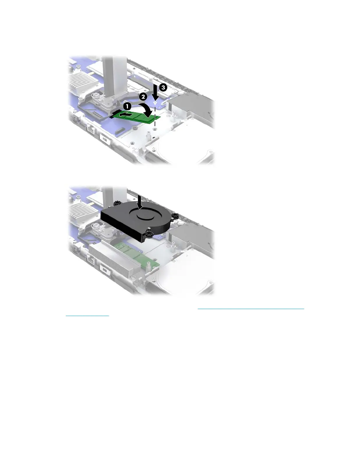 other end of the SSD down (2), and then secure the SSD to the system board with the screw (3).