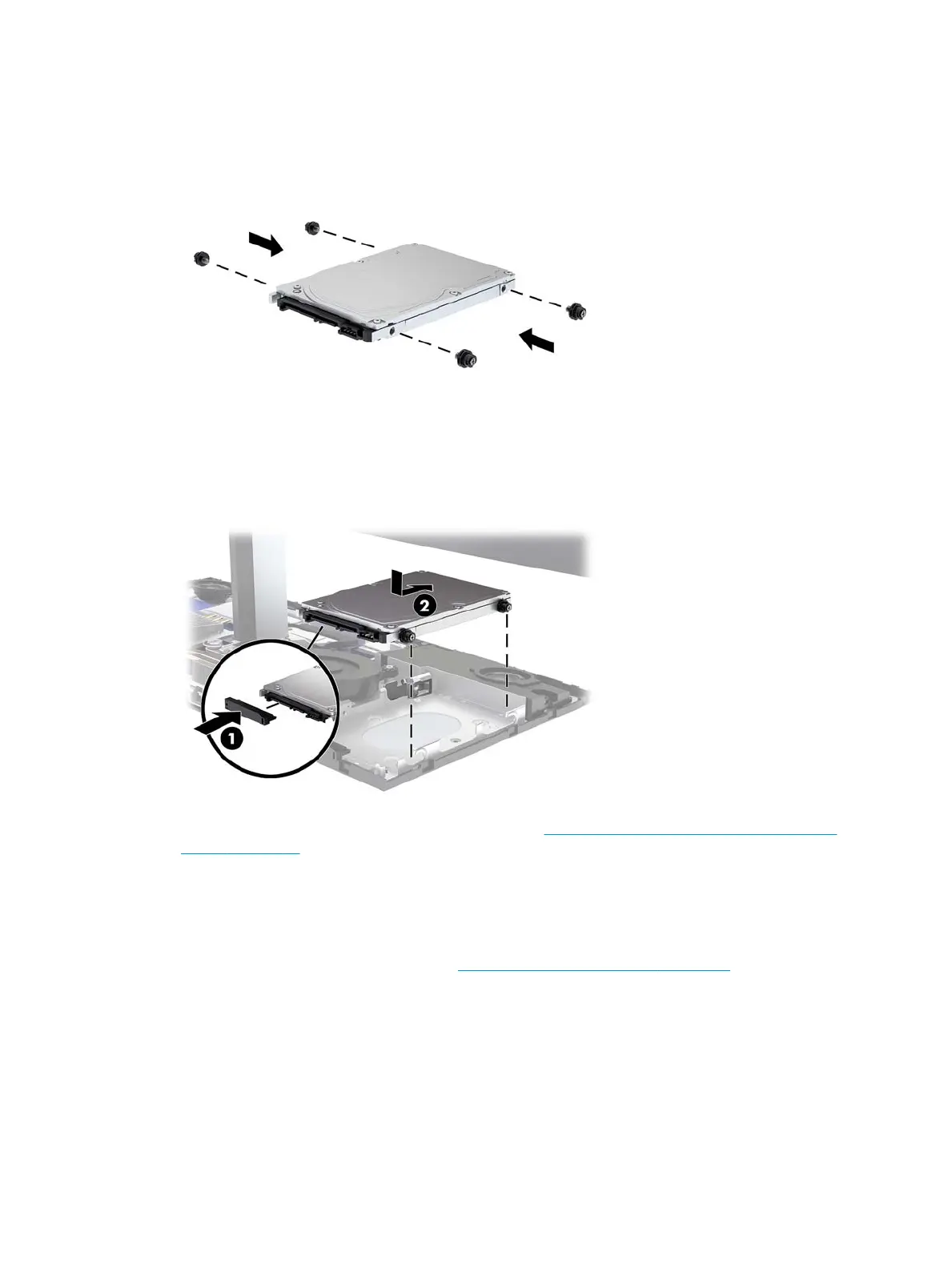 8. Connect the cable to the rear of the hard drive (1). Then align the mounting screws on the drive with the