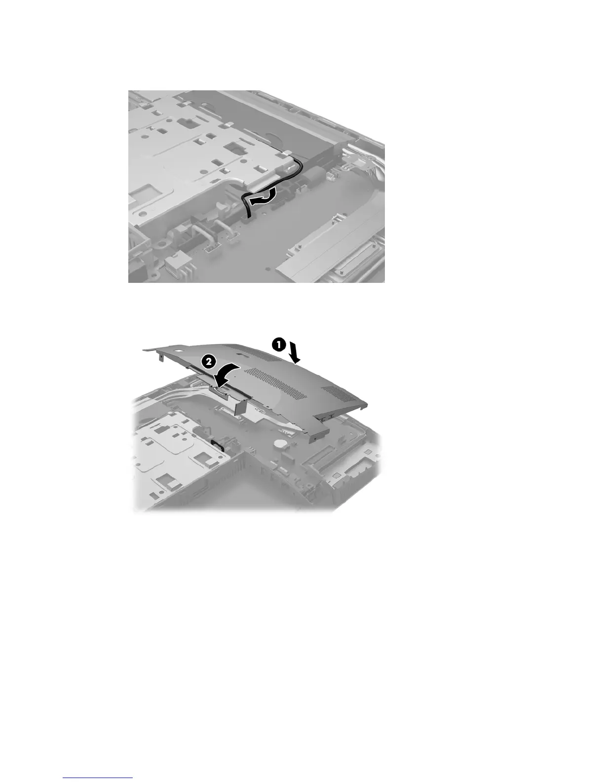 17. Engage the three tabs on the right side of the EMI shield with the slots in the computer (1), and then