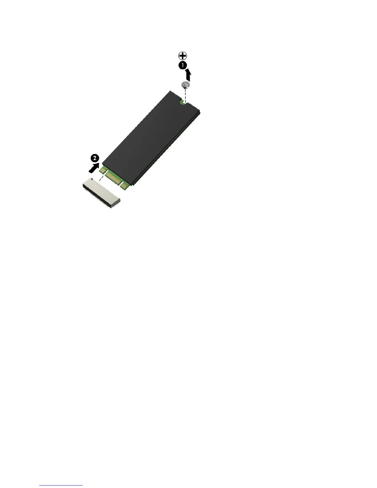 7. Lift the SSD to a 45-degree angle, and then pull it away to remove it from the socket (2).