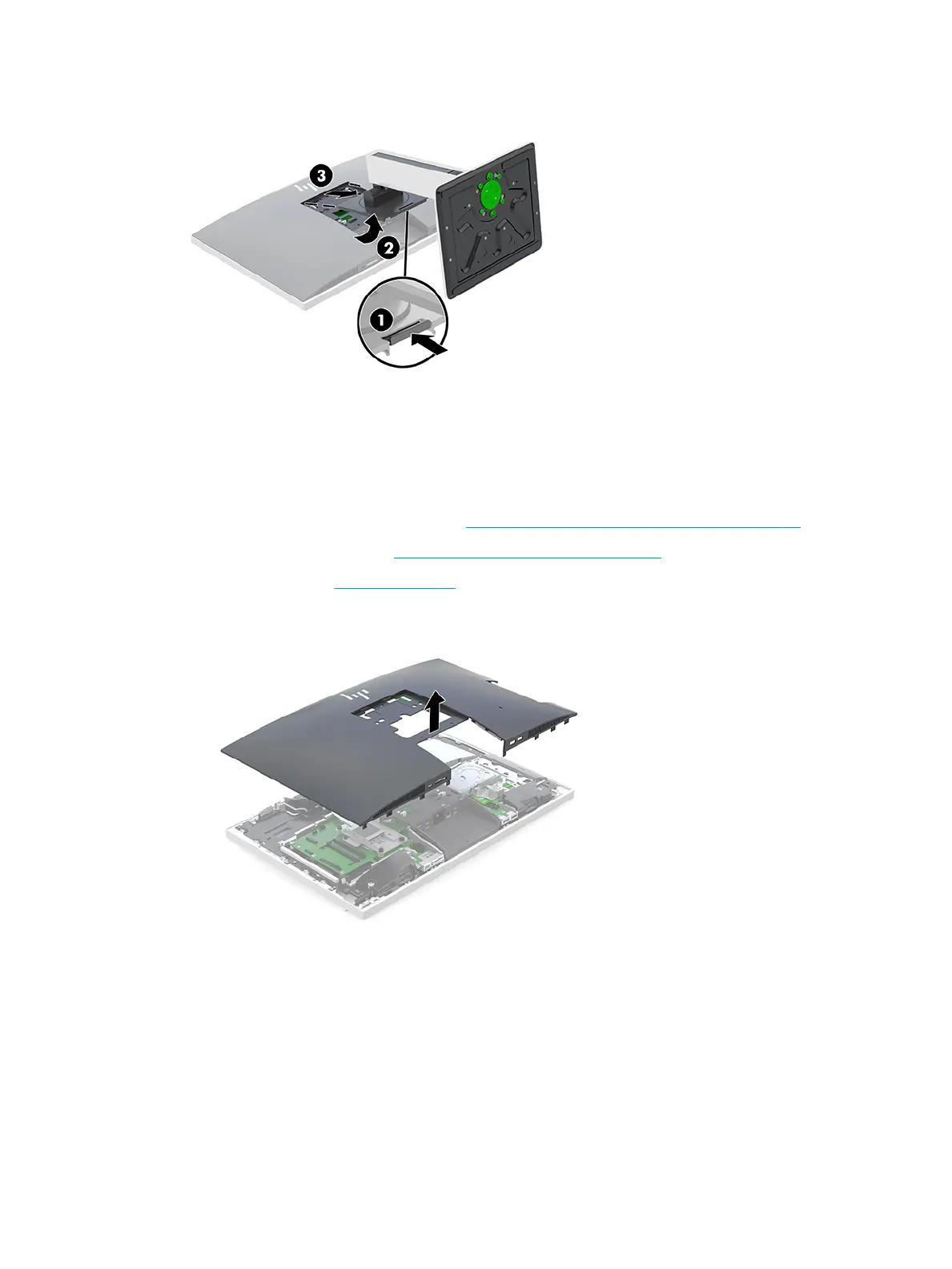 4. Lift the stand up (2), and then pull the stand hooks out of the computer (3).