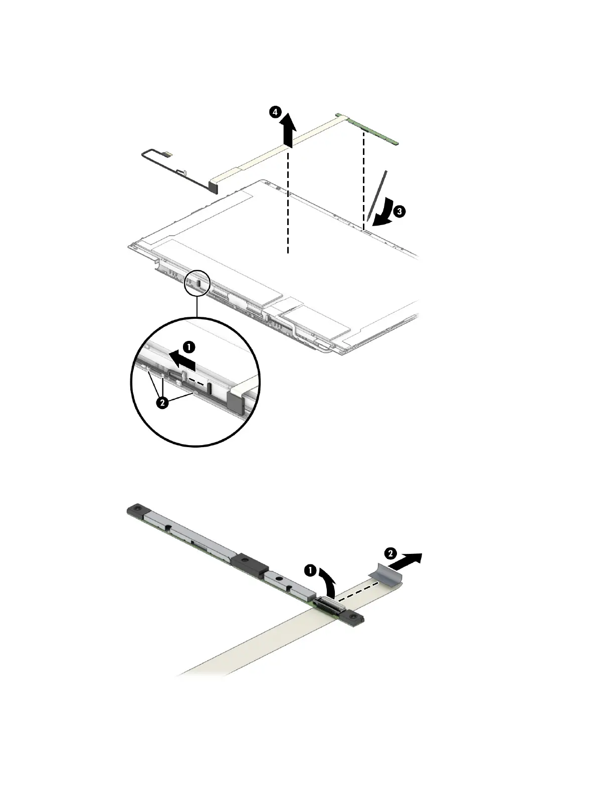 cable from the connector (2). Locate the display cable locations (3). Use a plastic tool to pull the camera