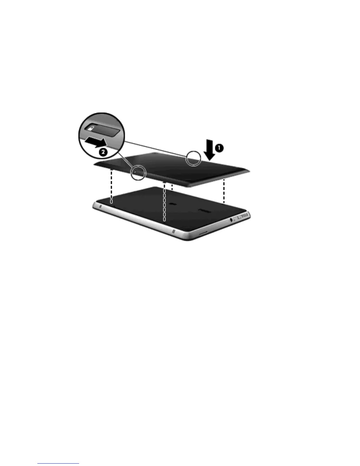 4. Slide the battery release latches (2) to lock the accessory battery into place on the computer.