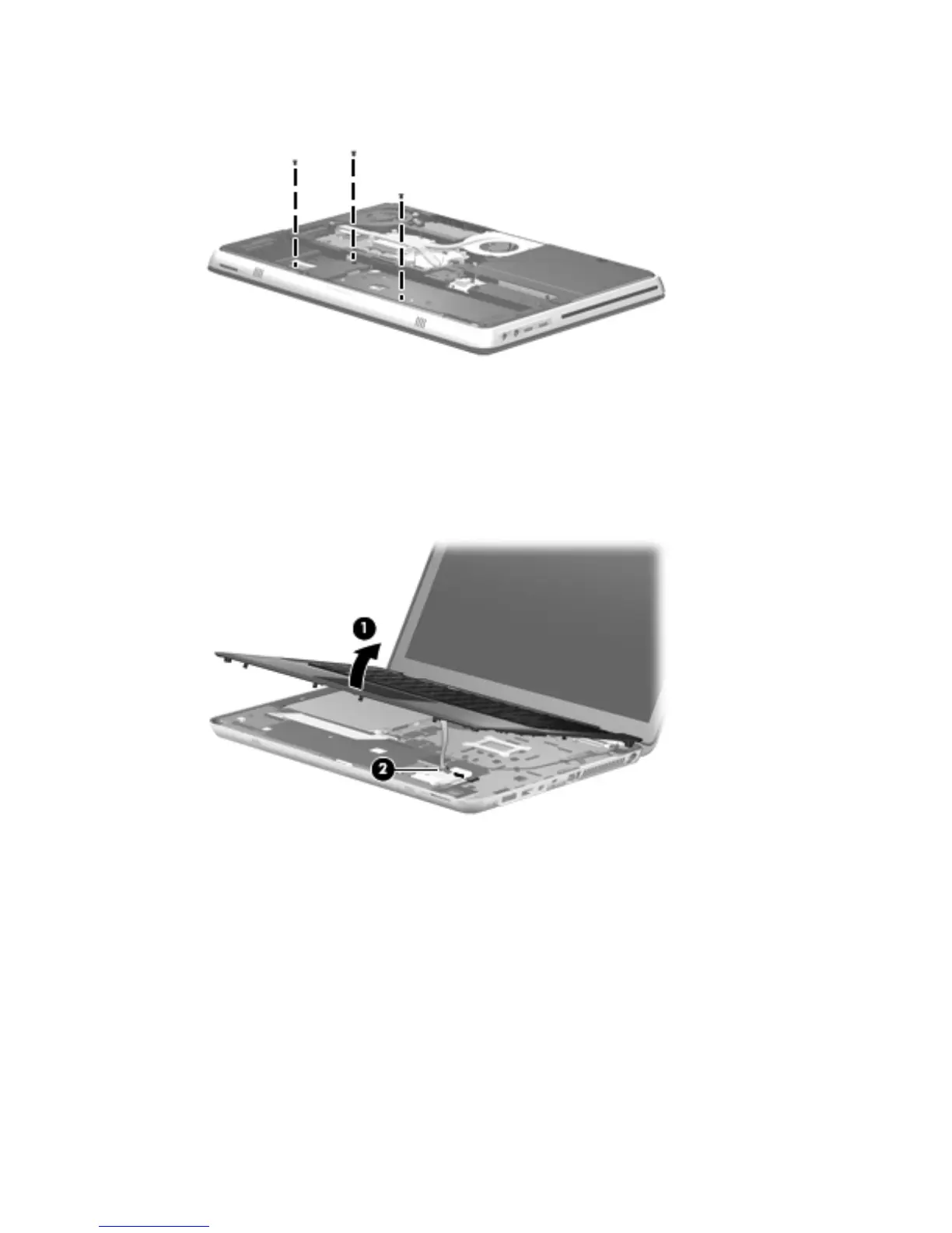 7. Slide the top cover (1) forward until the power button board cable, keyboard cable, and
