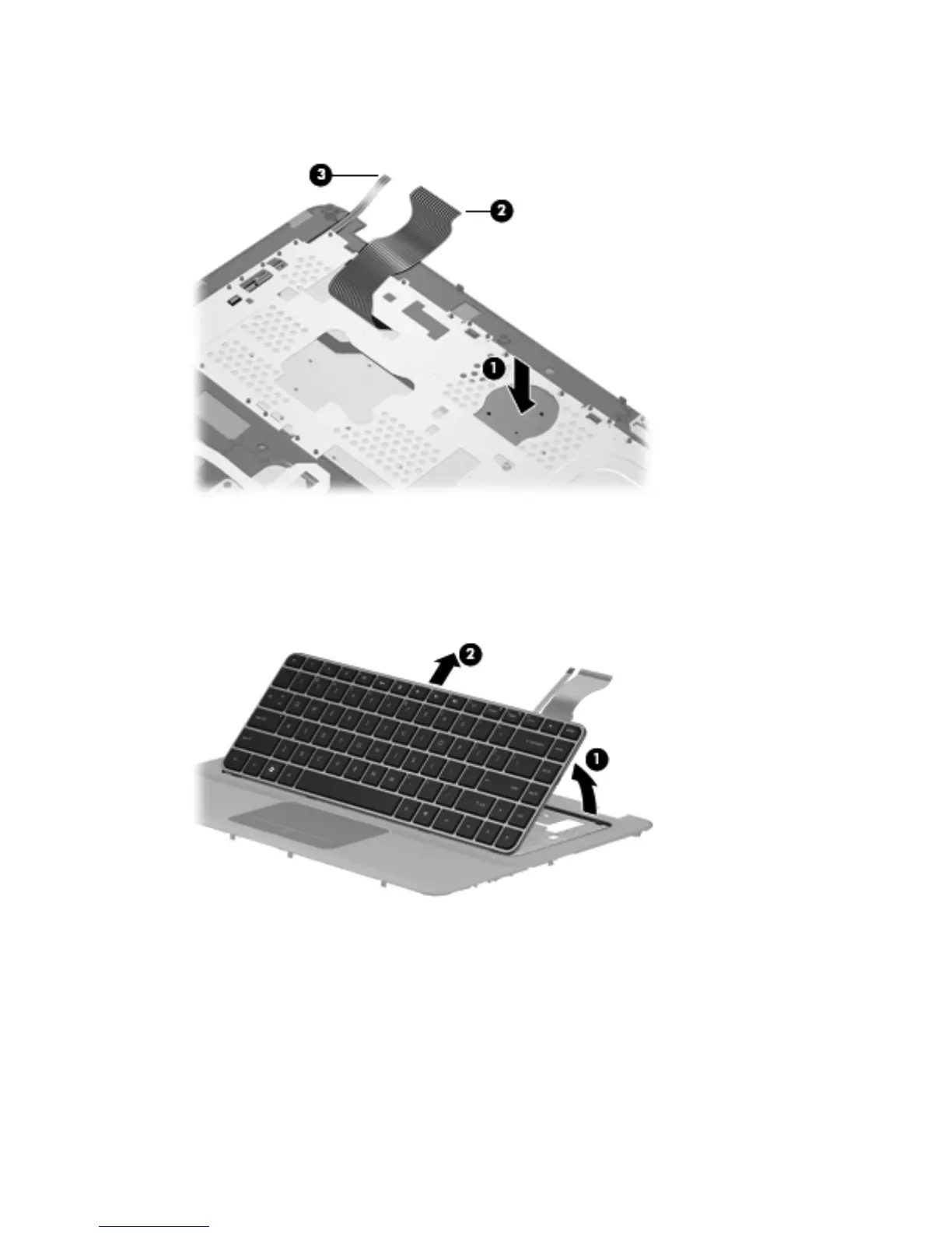 6. Slide the keyboard (2) back at an angle until the tabs on the front edge of keyboard disengage