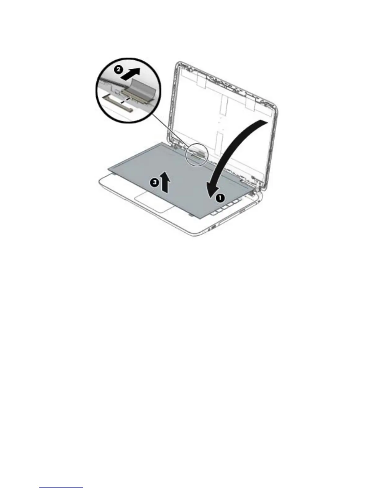 e. Release the tab and disconnect the display panel cable connector (2). Lift the panel (3) to remove