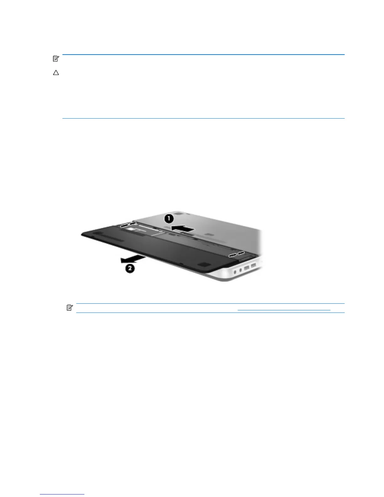 5. Slide the battery cover (2) away from the computer, and then remove the battery cover.