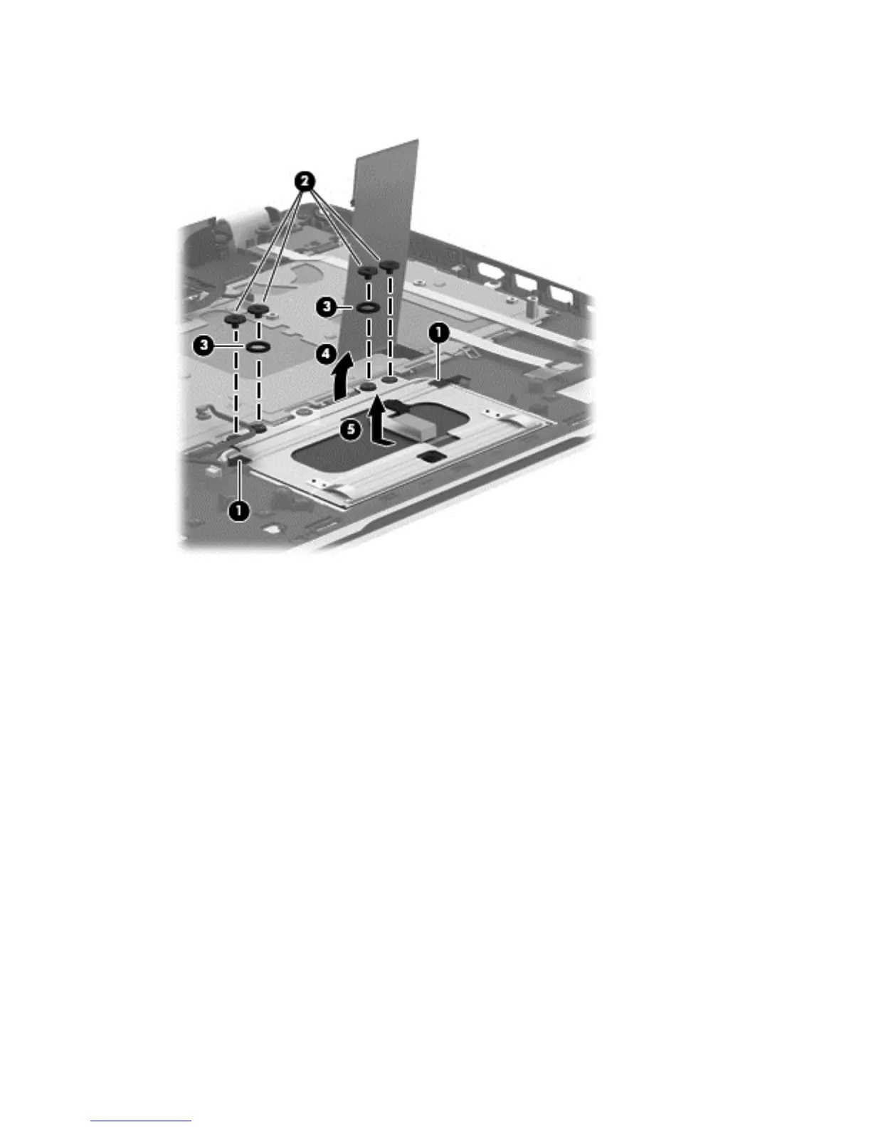 6. Slide the TouchPad (5) toward the back of the top cover, and then lift the TouchPad straight up