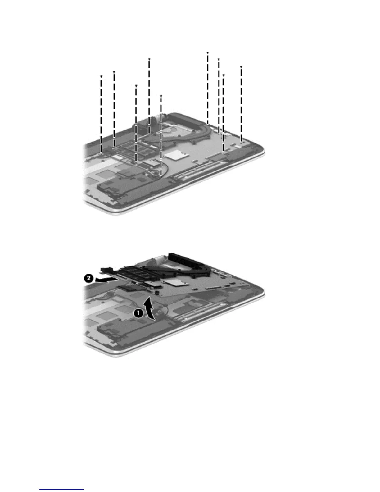 5. Remove the system board (2) by sliding it up and to the left an angle.