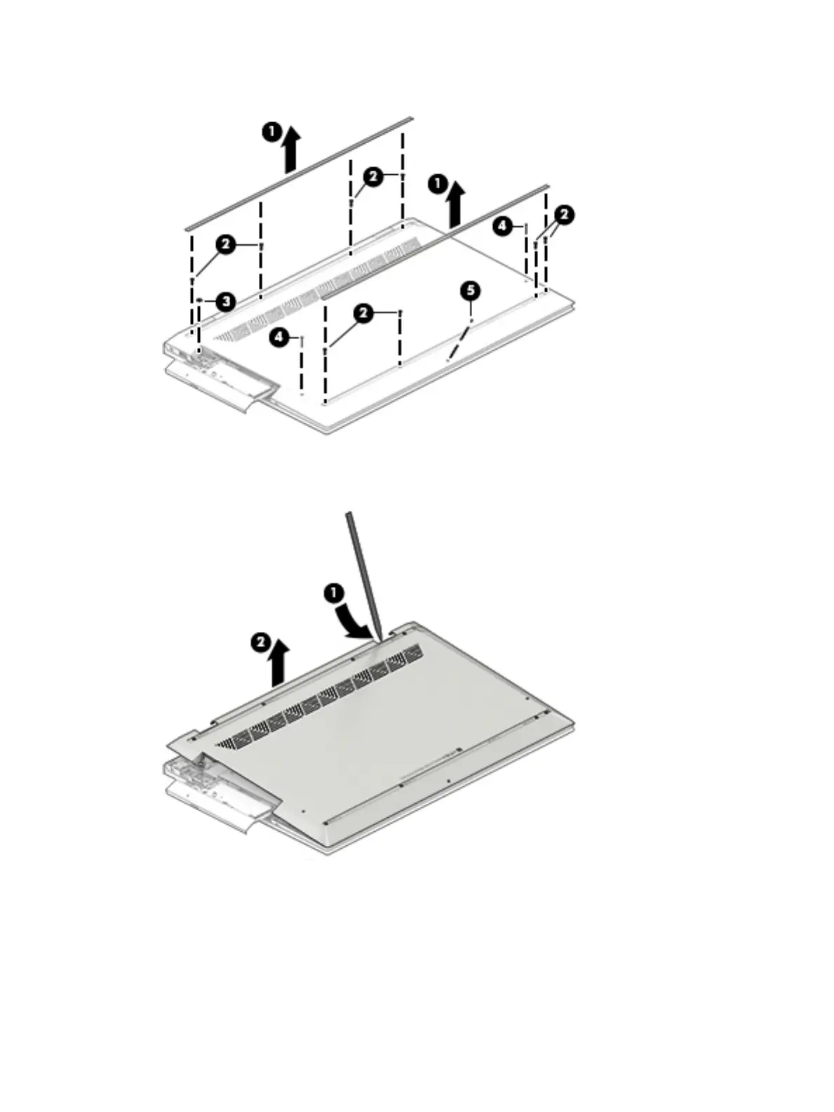 8. On the hinge side, lift up near both hinges to remove the bottom cover from the computer (2).