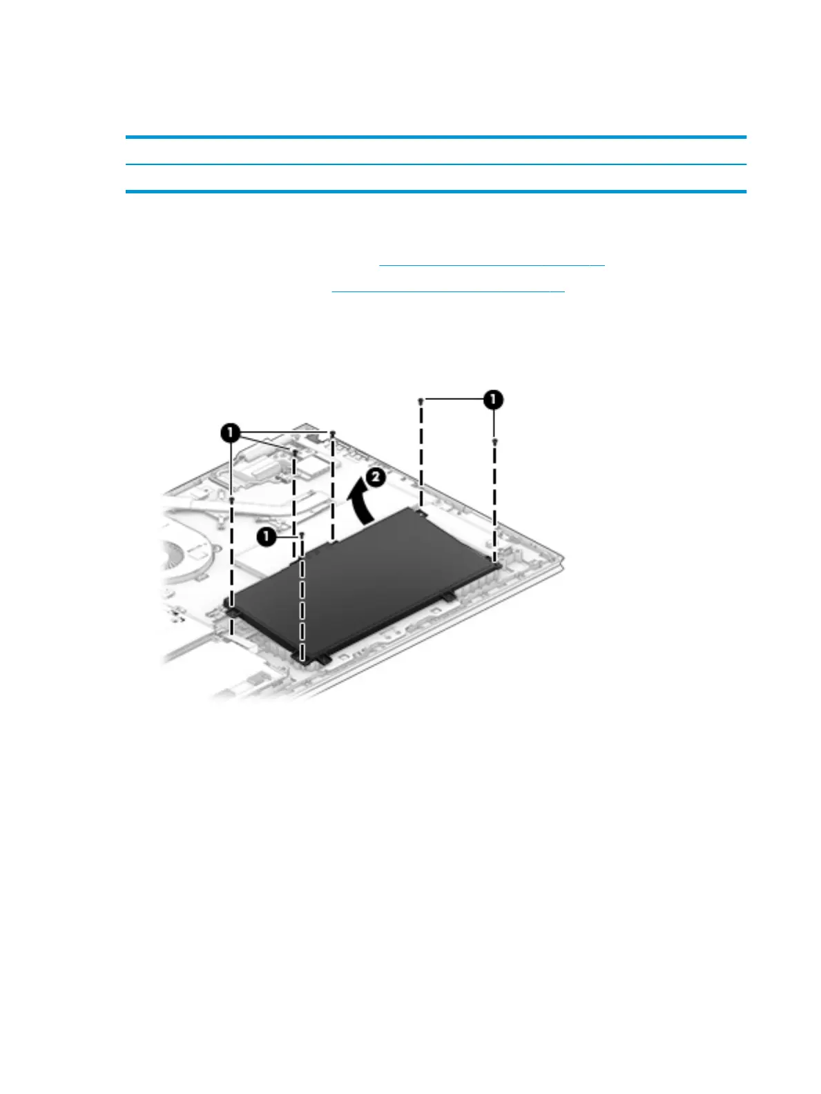 1. Remove the six Phillips M2.0 × 4.0 screws (1) that secure the battery to the computer.
