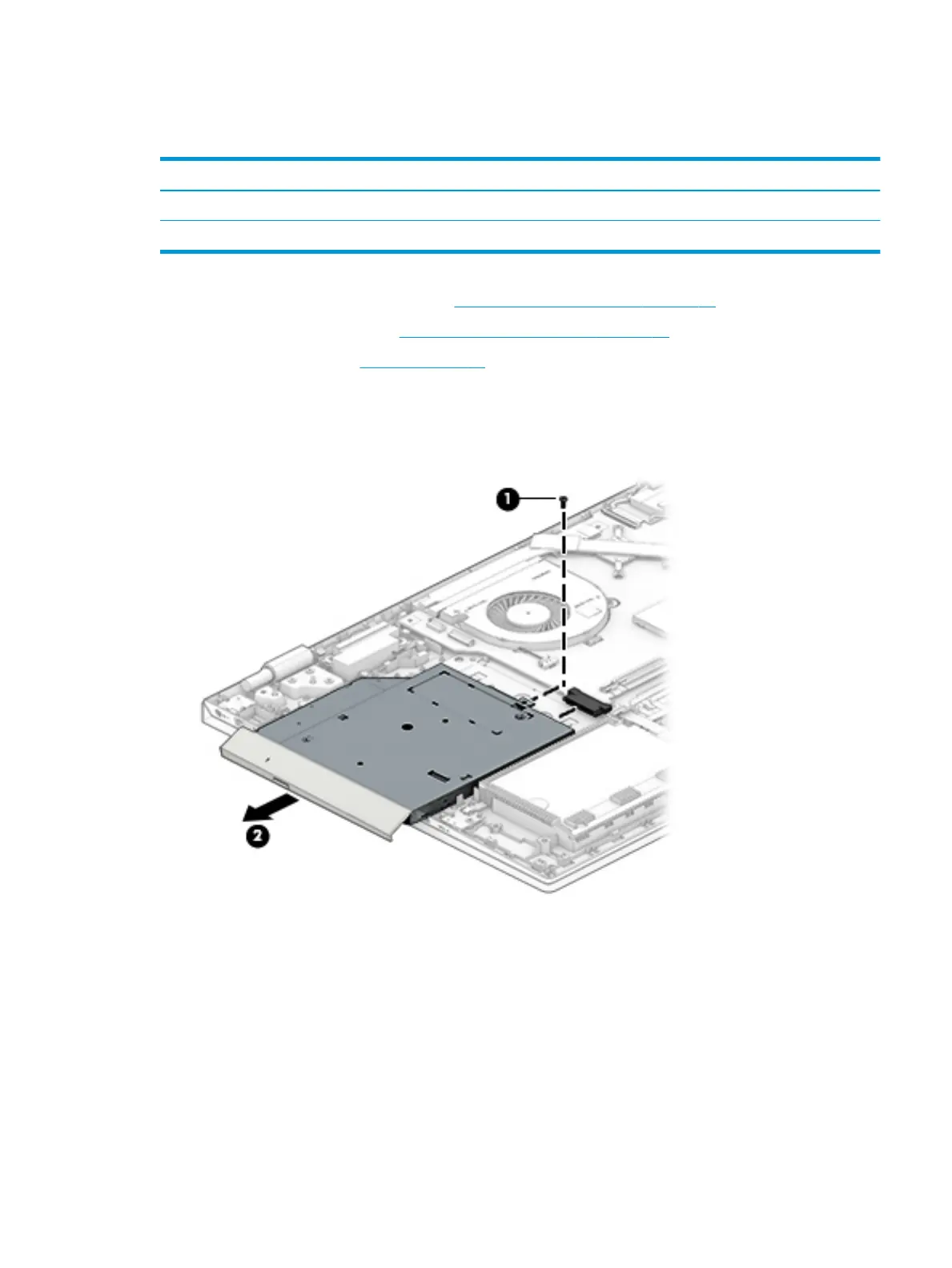 1. Remove the Phillips M2.0 × 3.0 screw (1) that secures the optical drive to the computer.