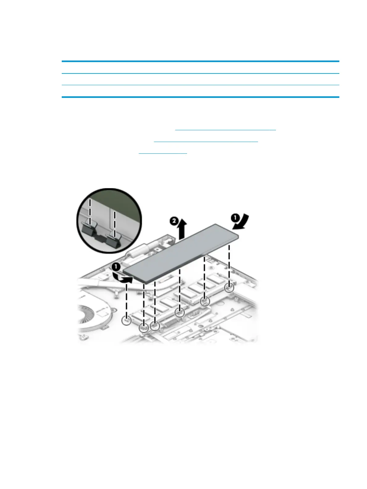 1. Squeeze the ends of the memory cover (1), and then lift the cover o the system board (2).