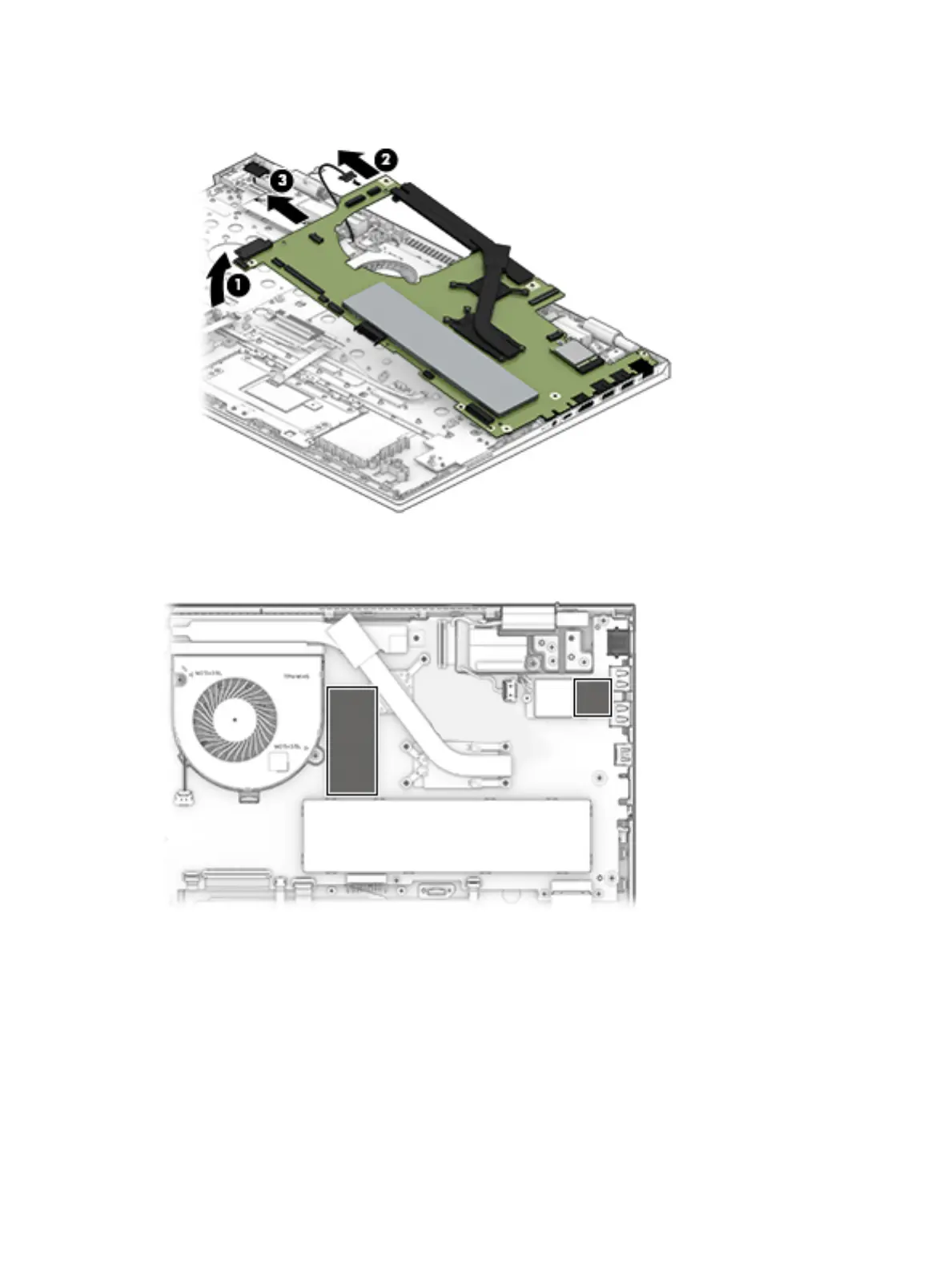 board (2), and then pull the system board to the left to remove it from the computer (3).