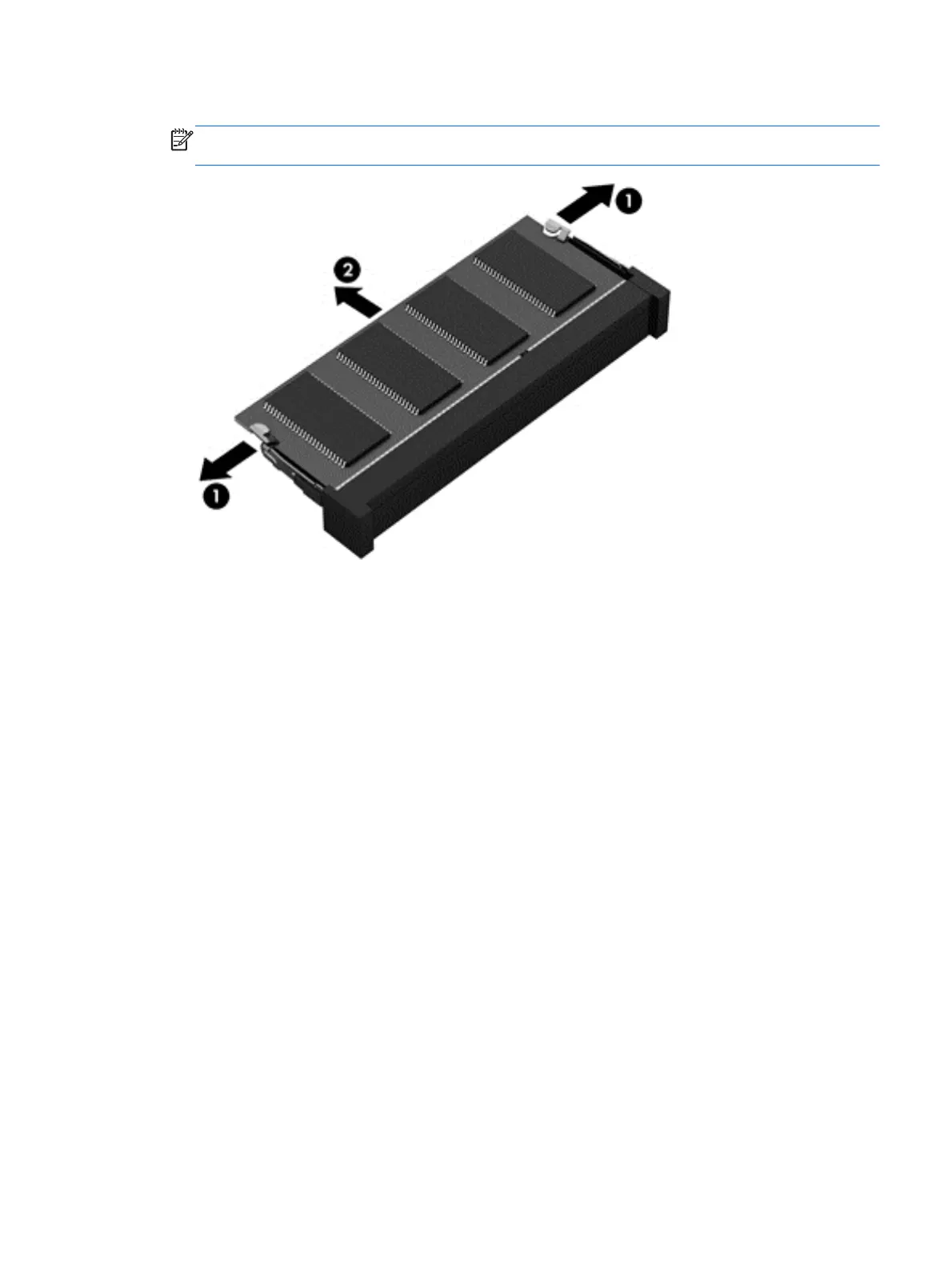 2. Remove the memory module (2) by pulling the module away from the slot at an angle.