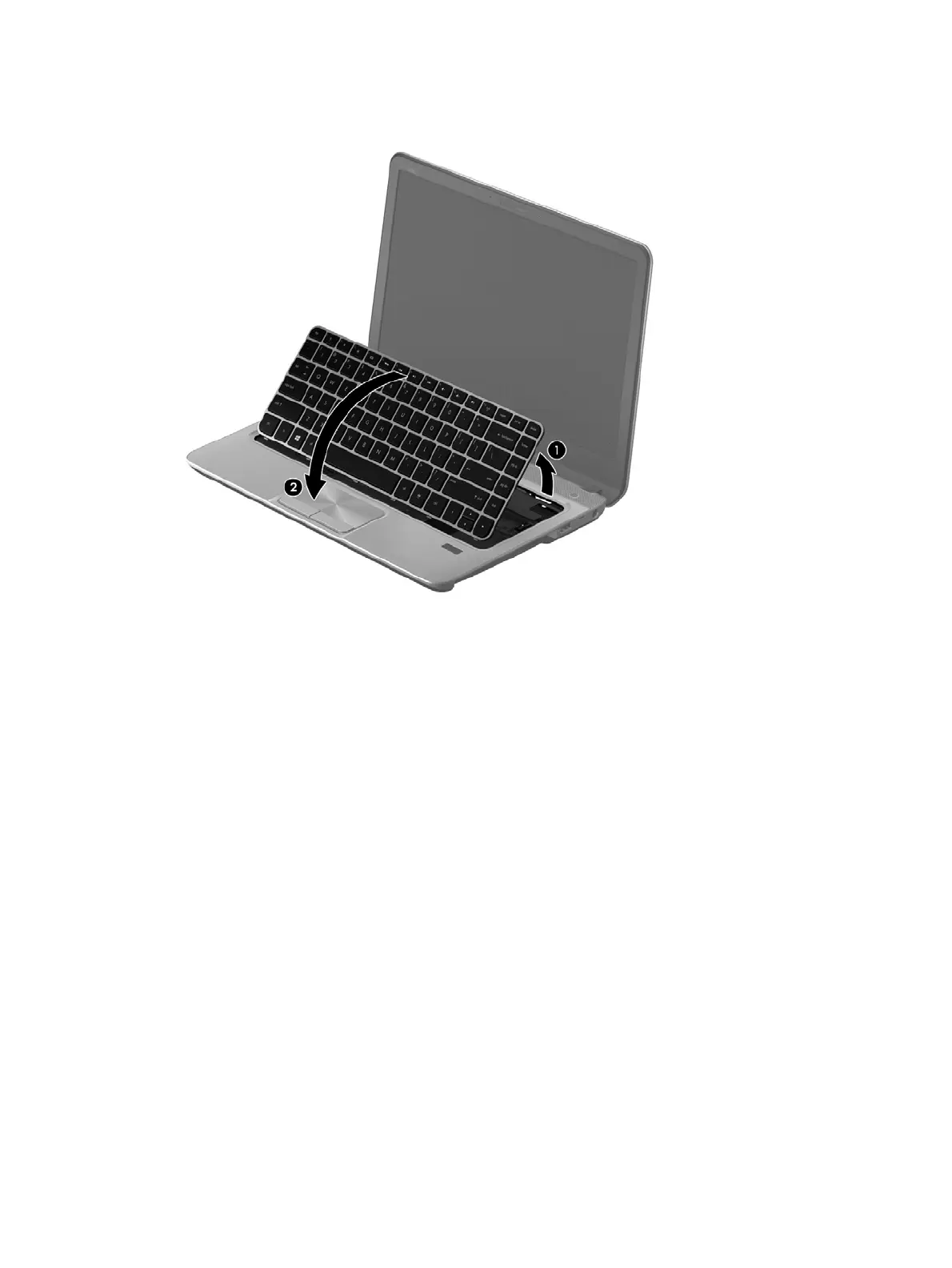 7. Lift the rear edge of the keyboard (1) until the keyboard rests at an angle, and then swing the top