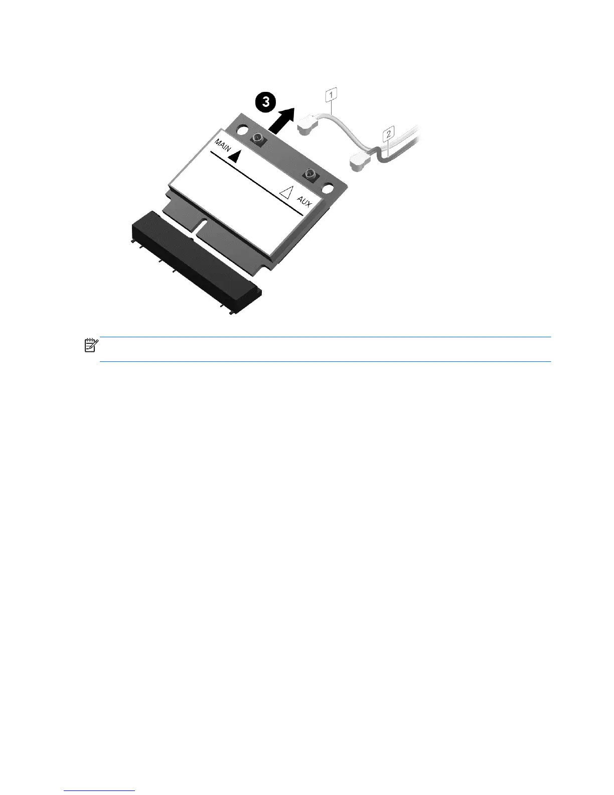 3. Remove the WLAN module by pulling the module away from the slot at an angle (3).