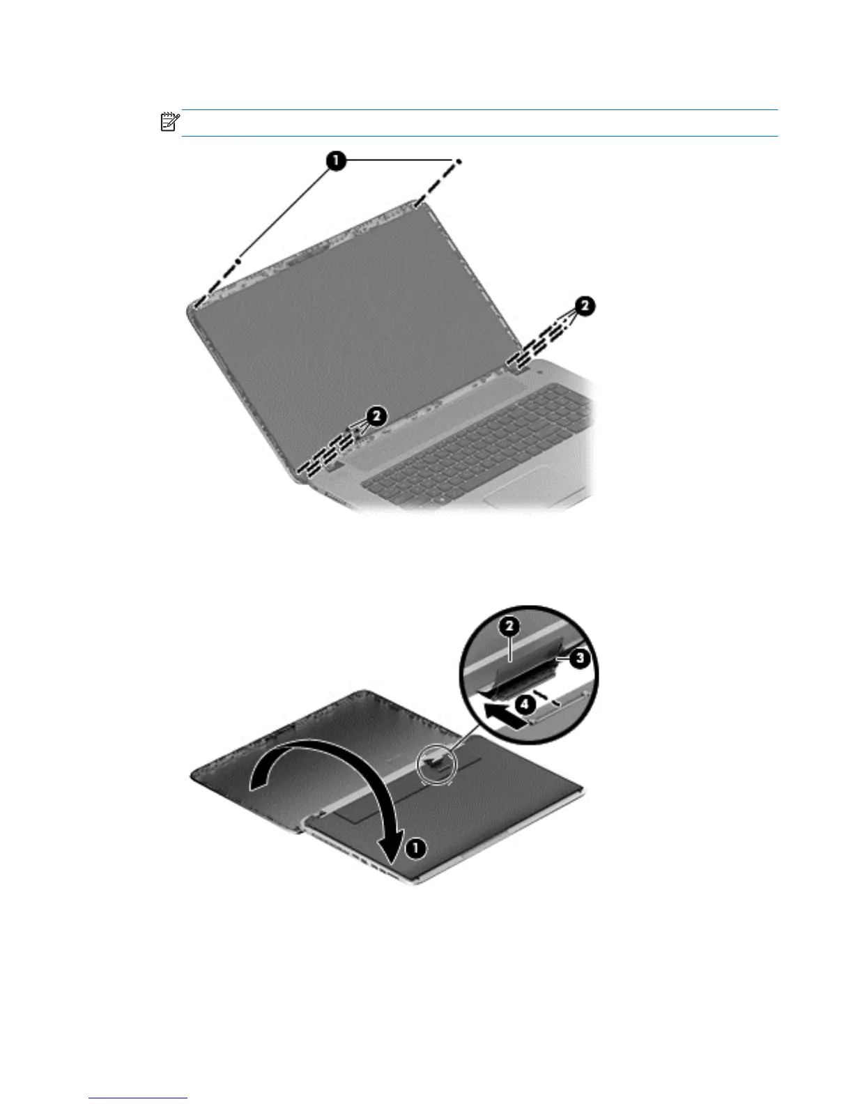 8. Support the display panel as you lean the panel forward (1), and then release the support strip