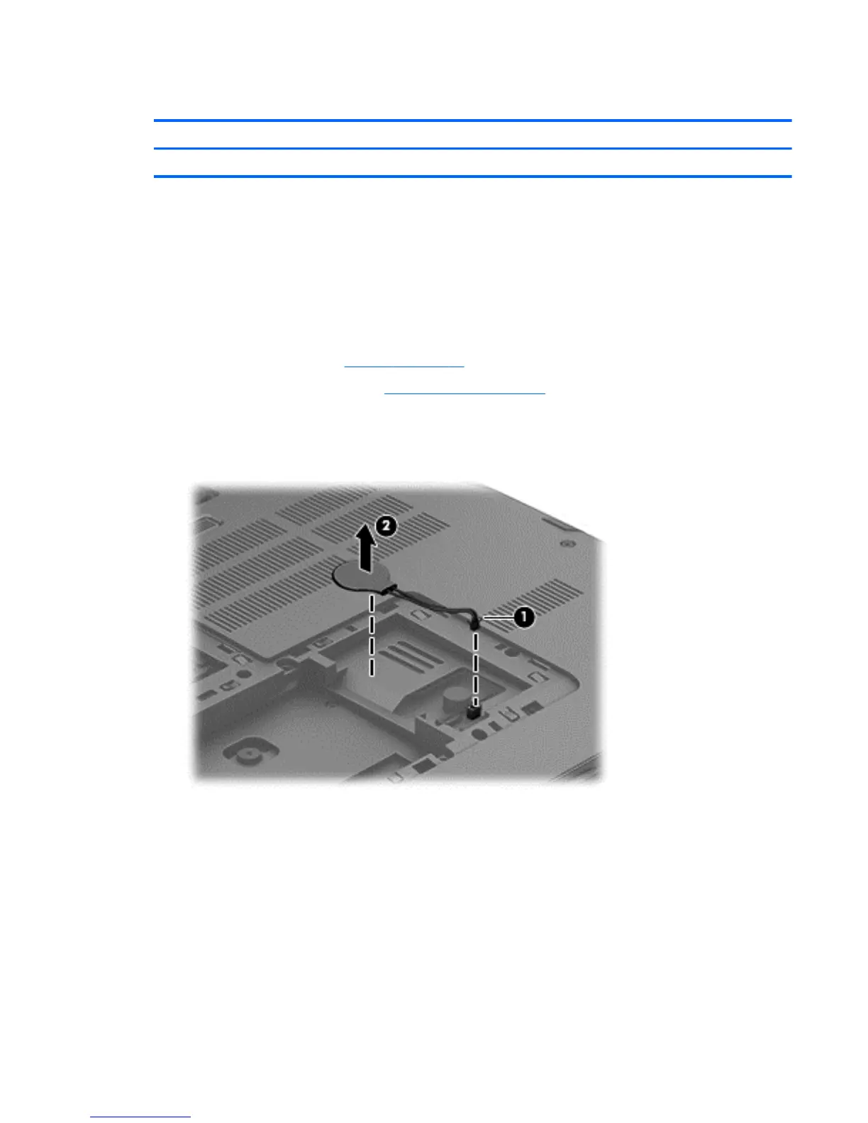 Disconnect the RTC battery cable from the system board (1). Use a thin, non-conductive tool to