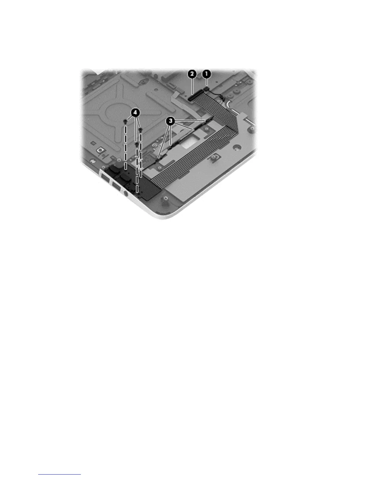 1. Disconnect the USB/Audio board cable (1) disconnect the ZIF connector for the ribbon cable (2)