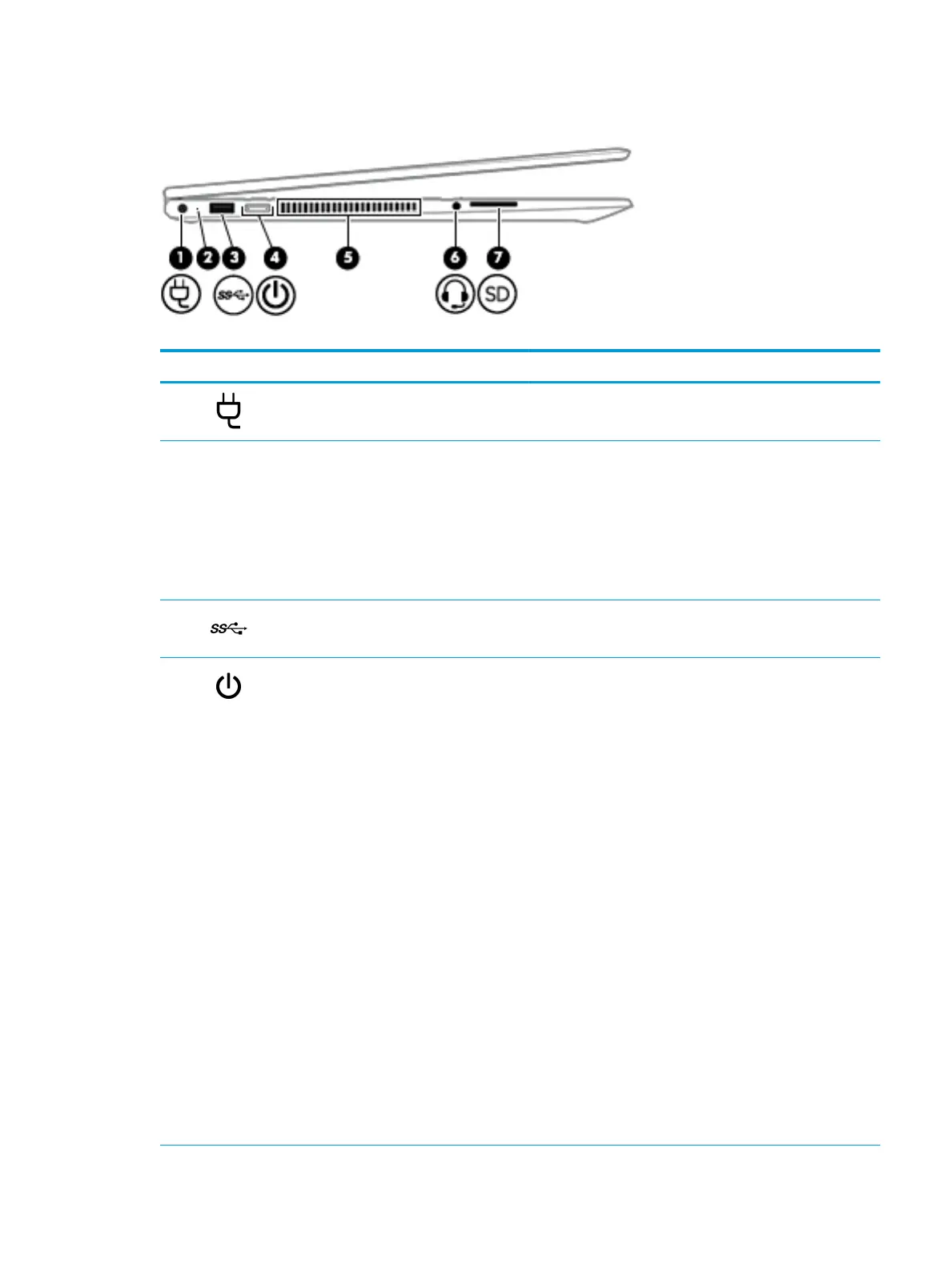 (3) USB SuperSpeed port Connects a USB device, such as a cell phone, camera, activity