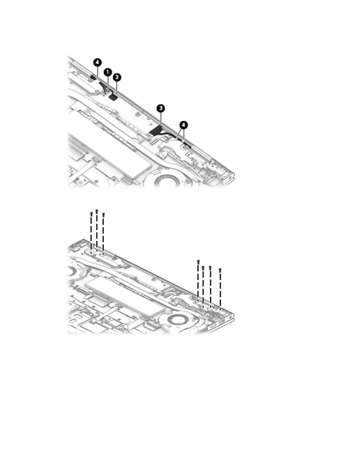 4. Release the webcam/microphone module cable and display panel cable from the retention clips (4) and