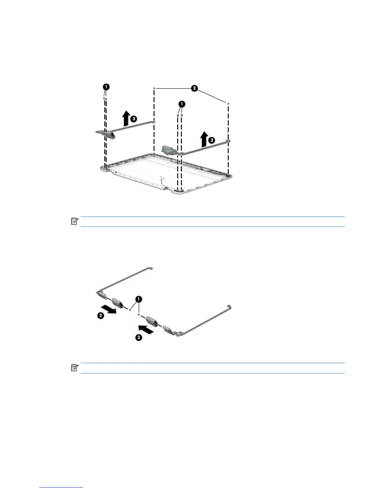 a. From the inside of the hinge covers, remove the two Phillips PM2.0×3.0 screws (one per hinge) (1)