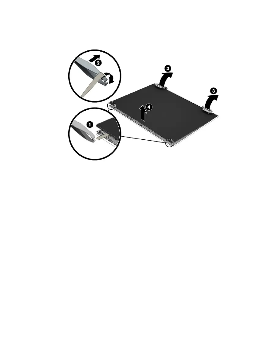 g. Peel the clear tape o the connector on the bottom of the display panel (2).