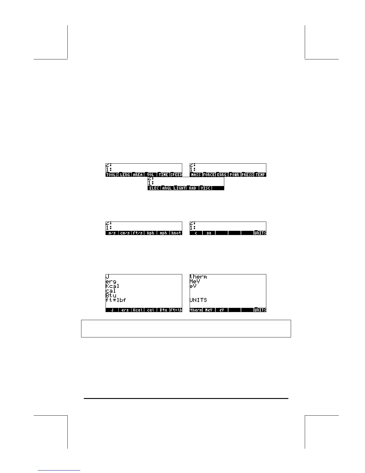 The following is a list of the units available in the UNITS menu. The unit