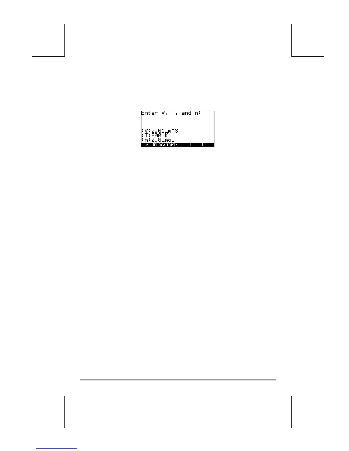 Enter values of V = 0.01_m^3, T = 300_K, and n = 0.8_mol. Before pressing