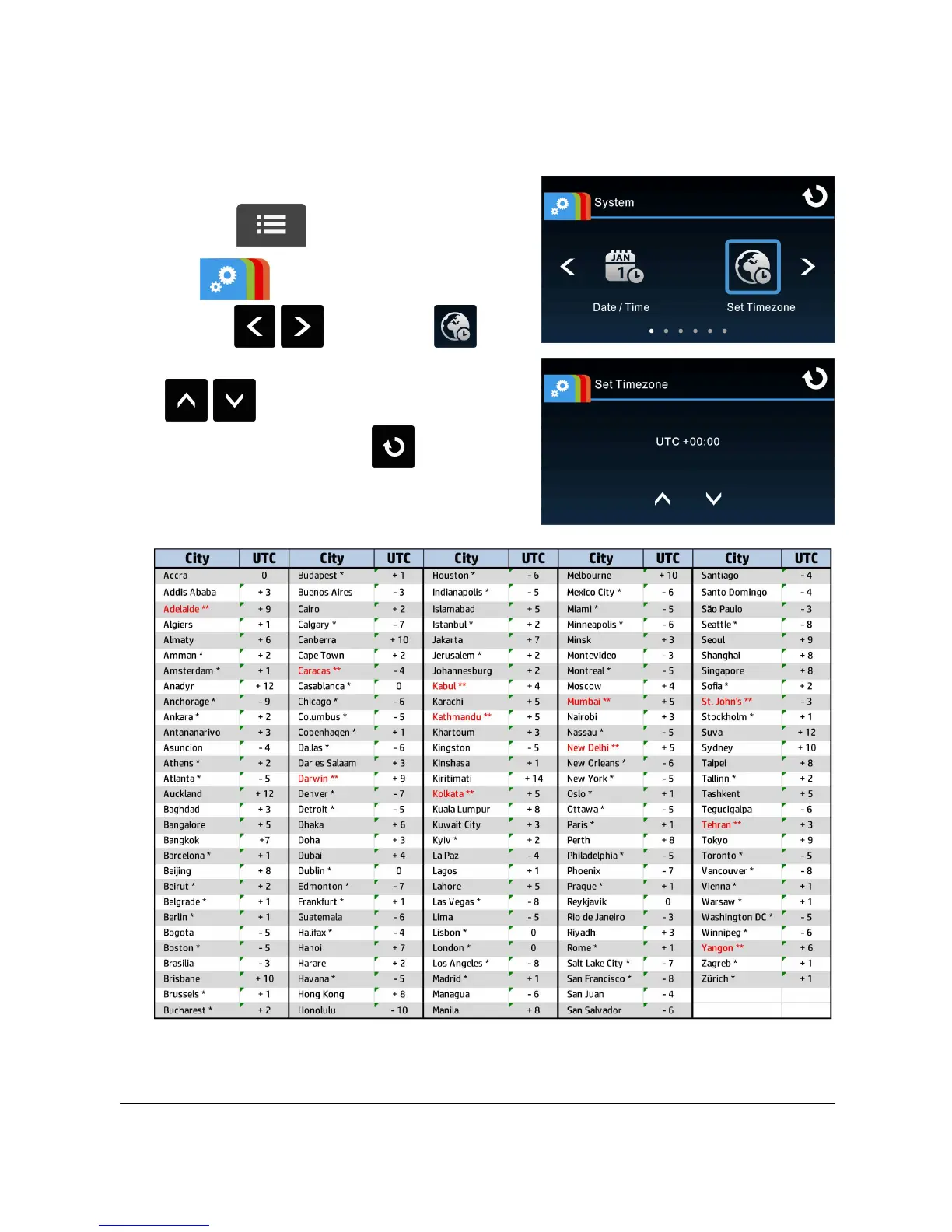 Set Timezone menu, touch