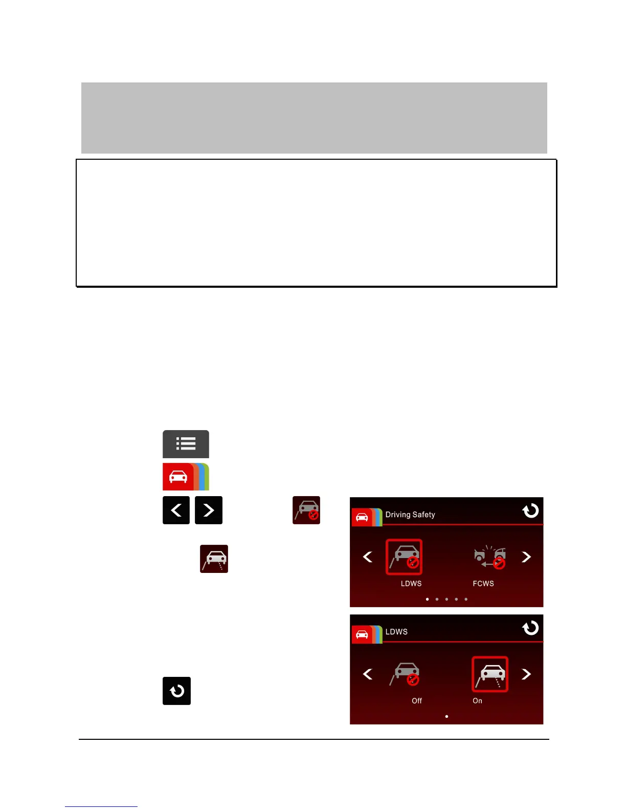 To set the LDWS (Lane Departure Warning Systems), do the following: