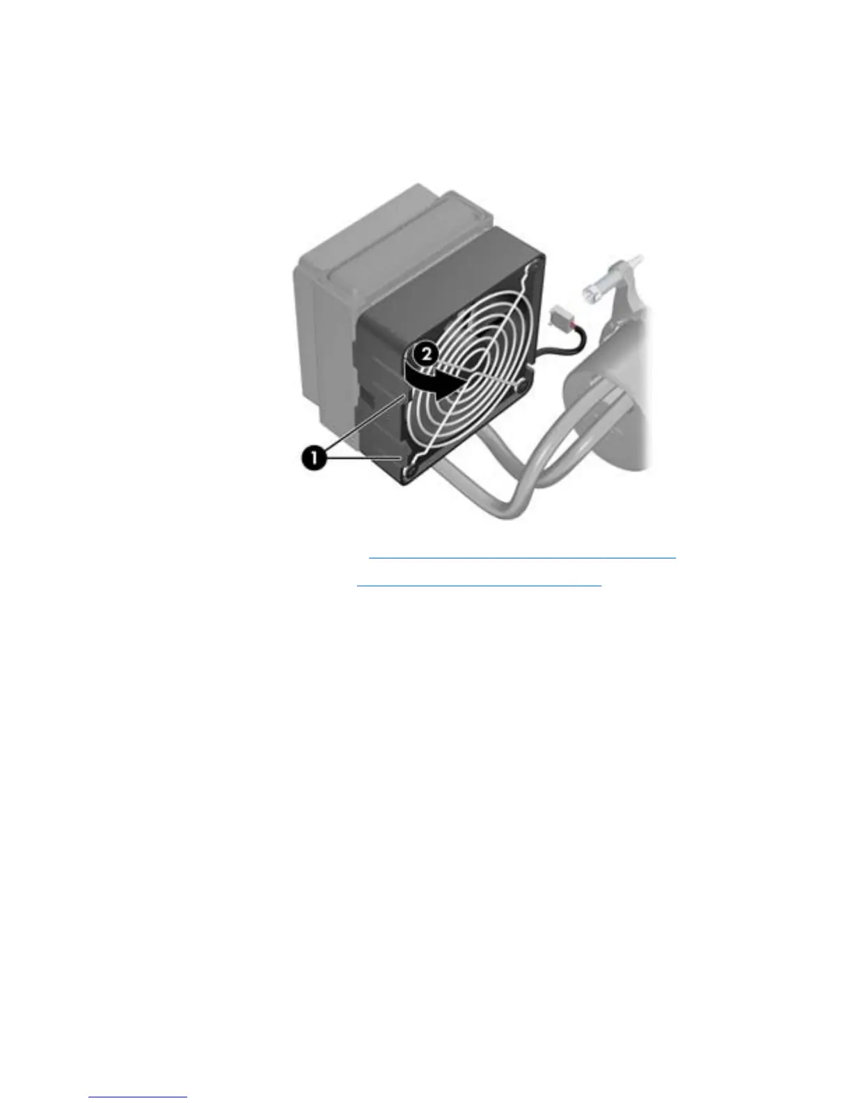 then rotating the fan out of the holder (2), as shown in the following figure. (Release the tabs when