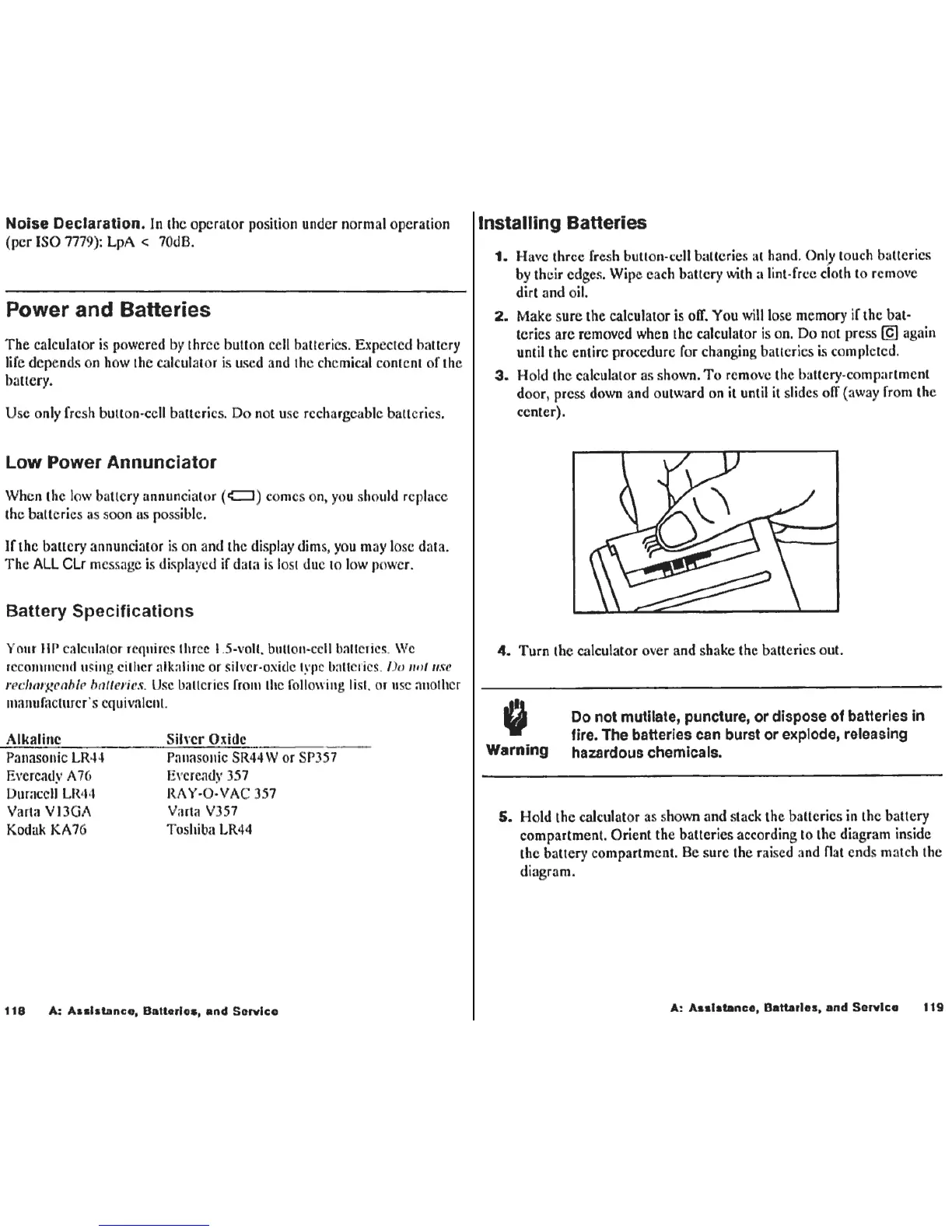 HP HP-10B - Power and Batteries; Low Power Annunciator; Battery Specifications; Installing Batteries