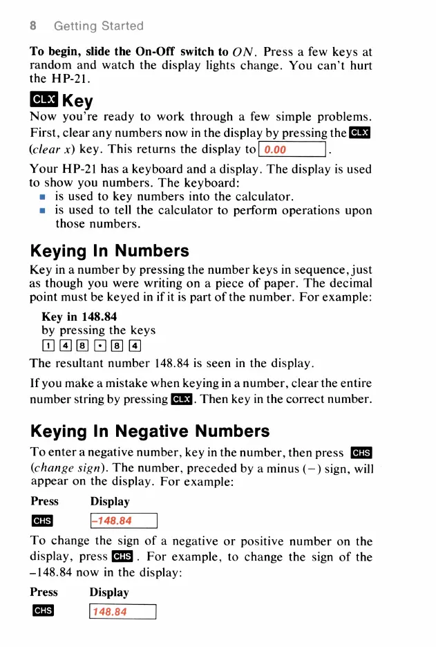 HP HP-21 - CLX Key Ottt E; Keying in Numbers; Keying in Negative Numbers
