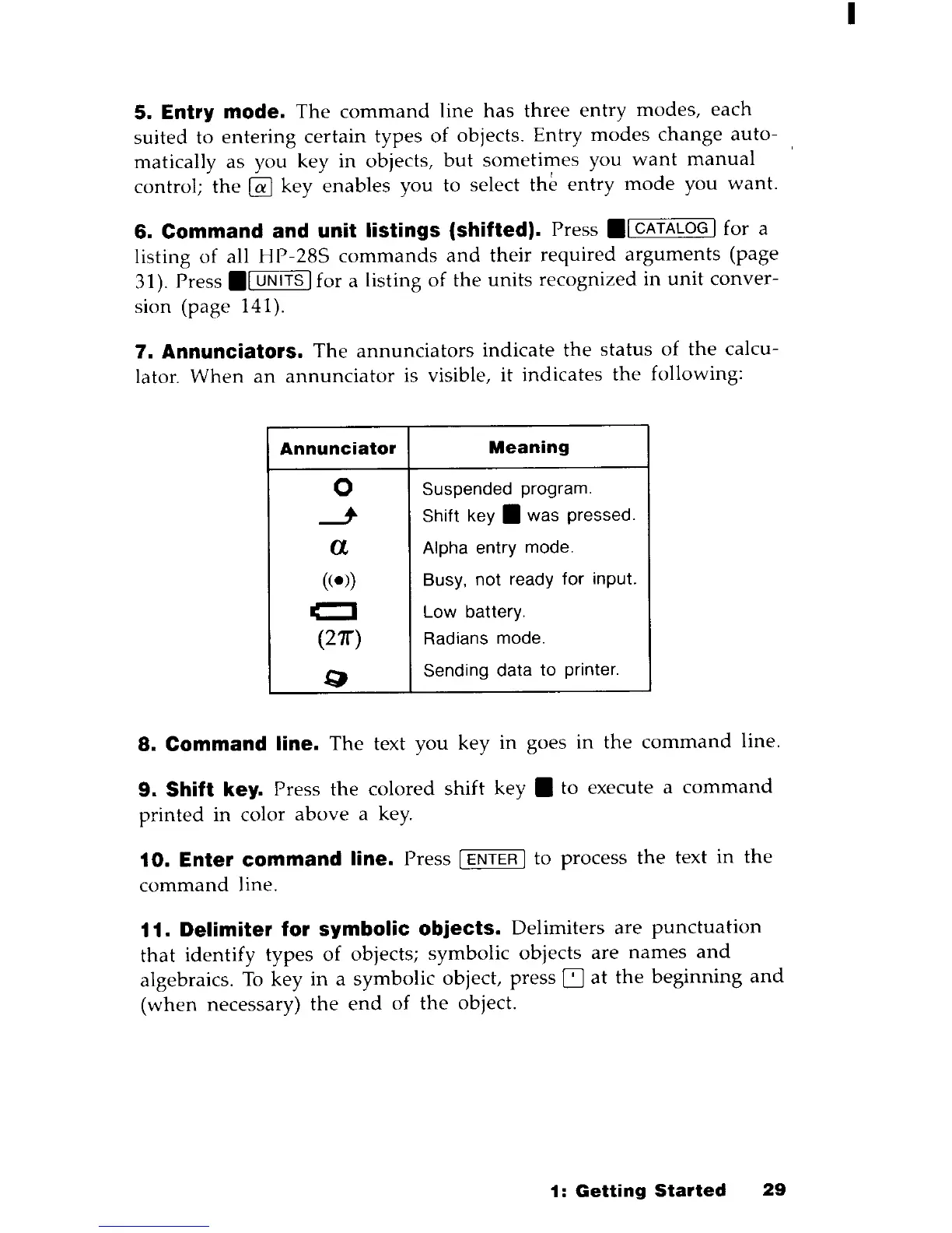 HP HP-28S - Entry Mode; Command and Unit Listings (Shifted), Command Line; Shift Key; Delimiter for Symbolic Objects