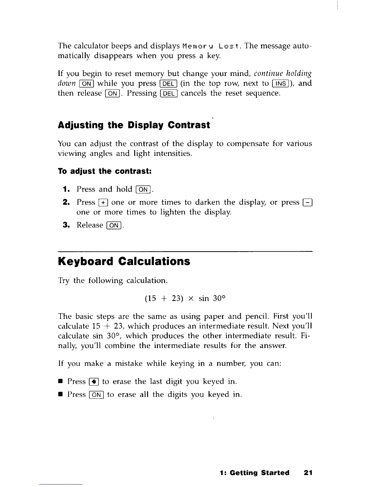 HP HP-28S - Adjusting the Display Contrast; Keyboard Calculations