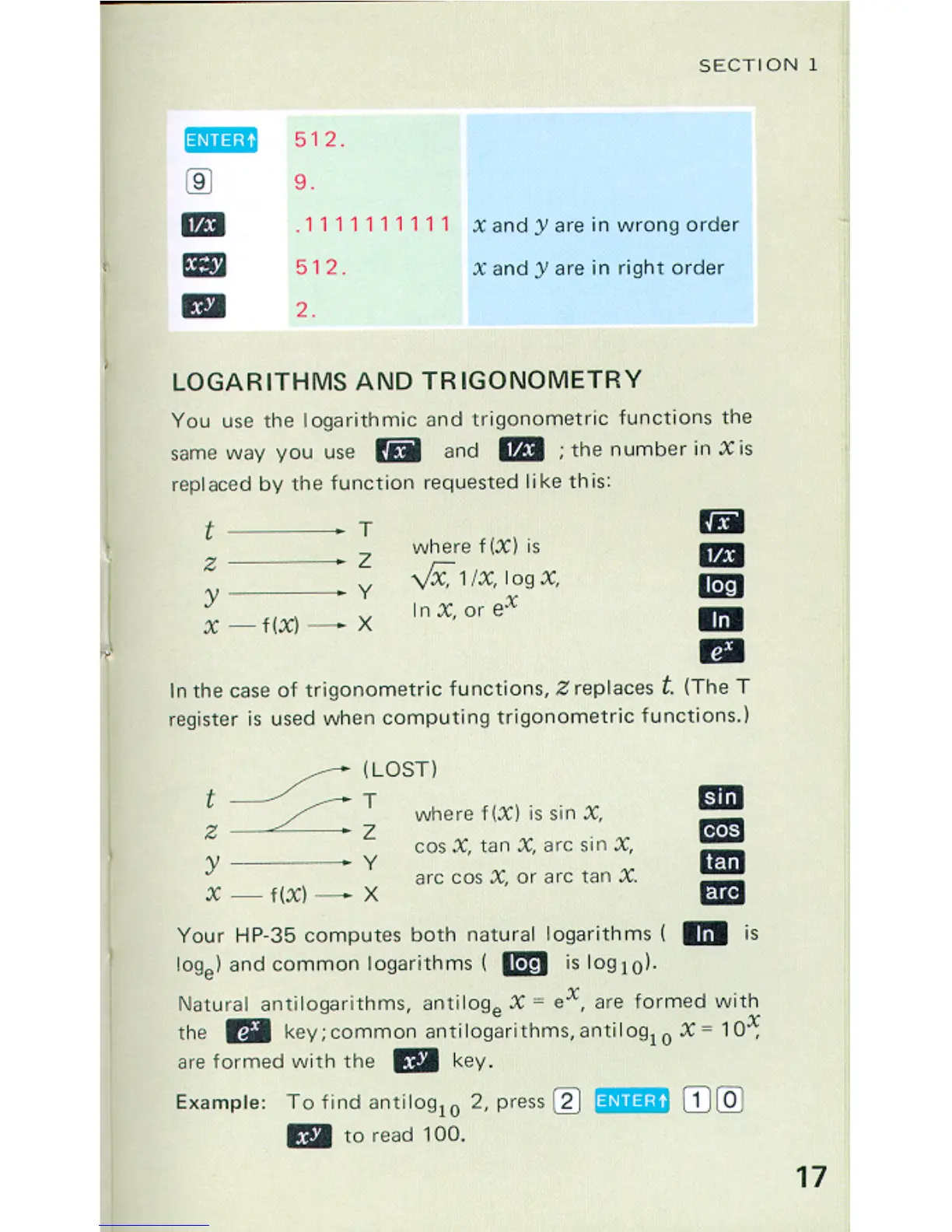 HP HP-35 - Advanced Topics and Examples; Logarithms and Trigonometry