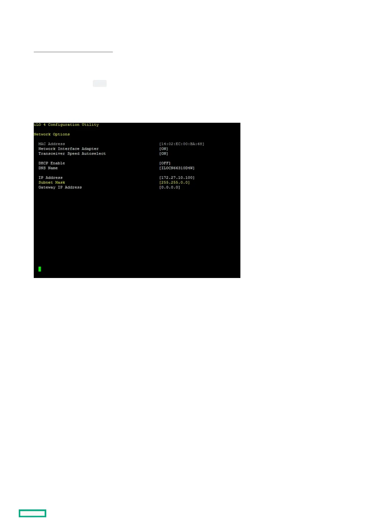 2. Navigate through the menu options System ConfigurationSystem Configuration > iLO 4 Configuration UtilityiLO 4 Configuration Utility > Network OptionsNetwork Options. The Network Options