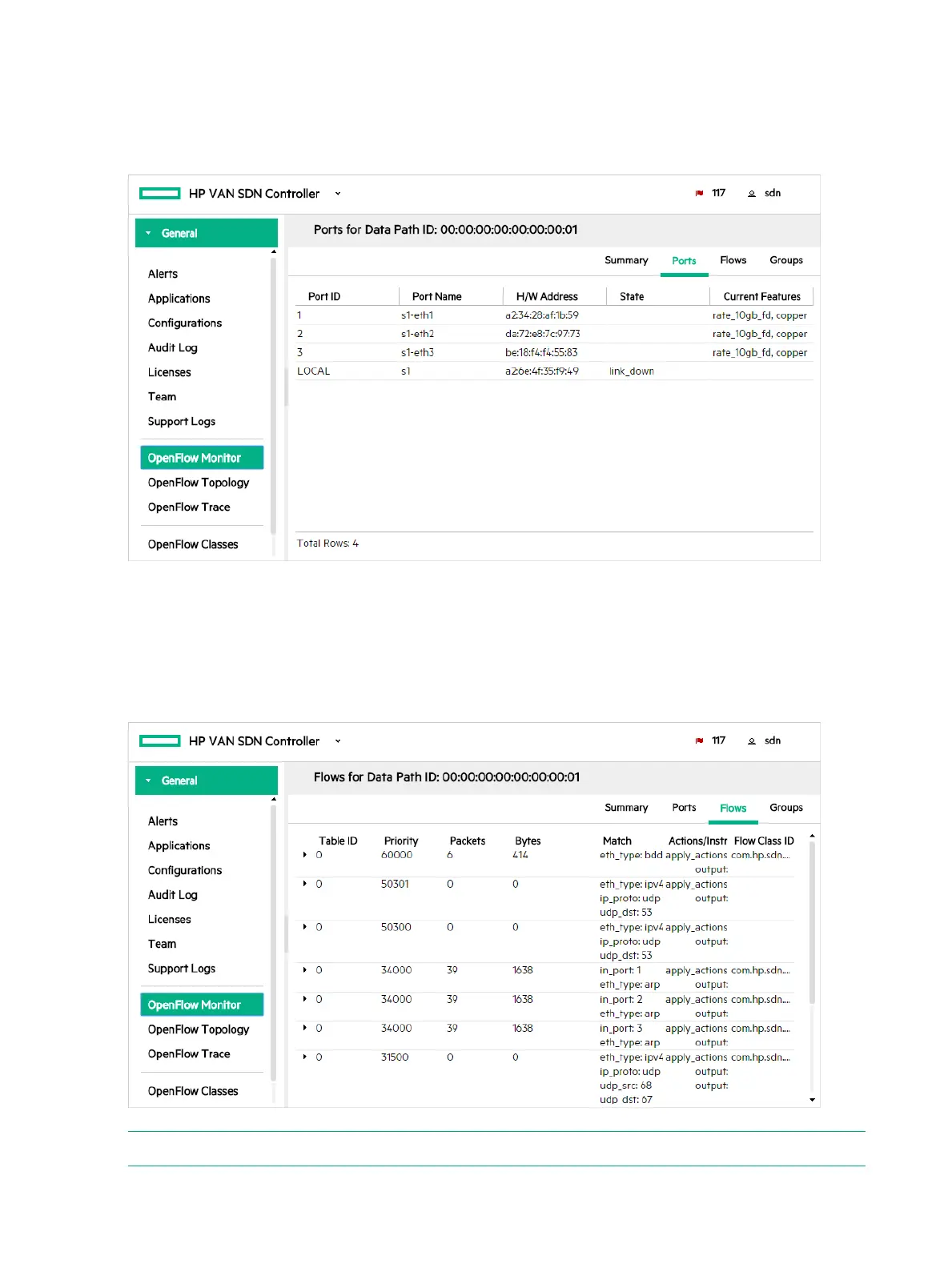 The OpenFlow Monitor→Ports view includes information on the ports used for OpenFlow traffic