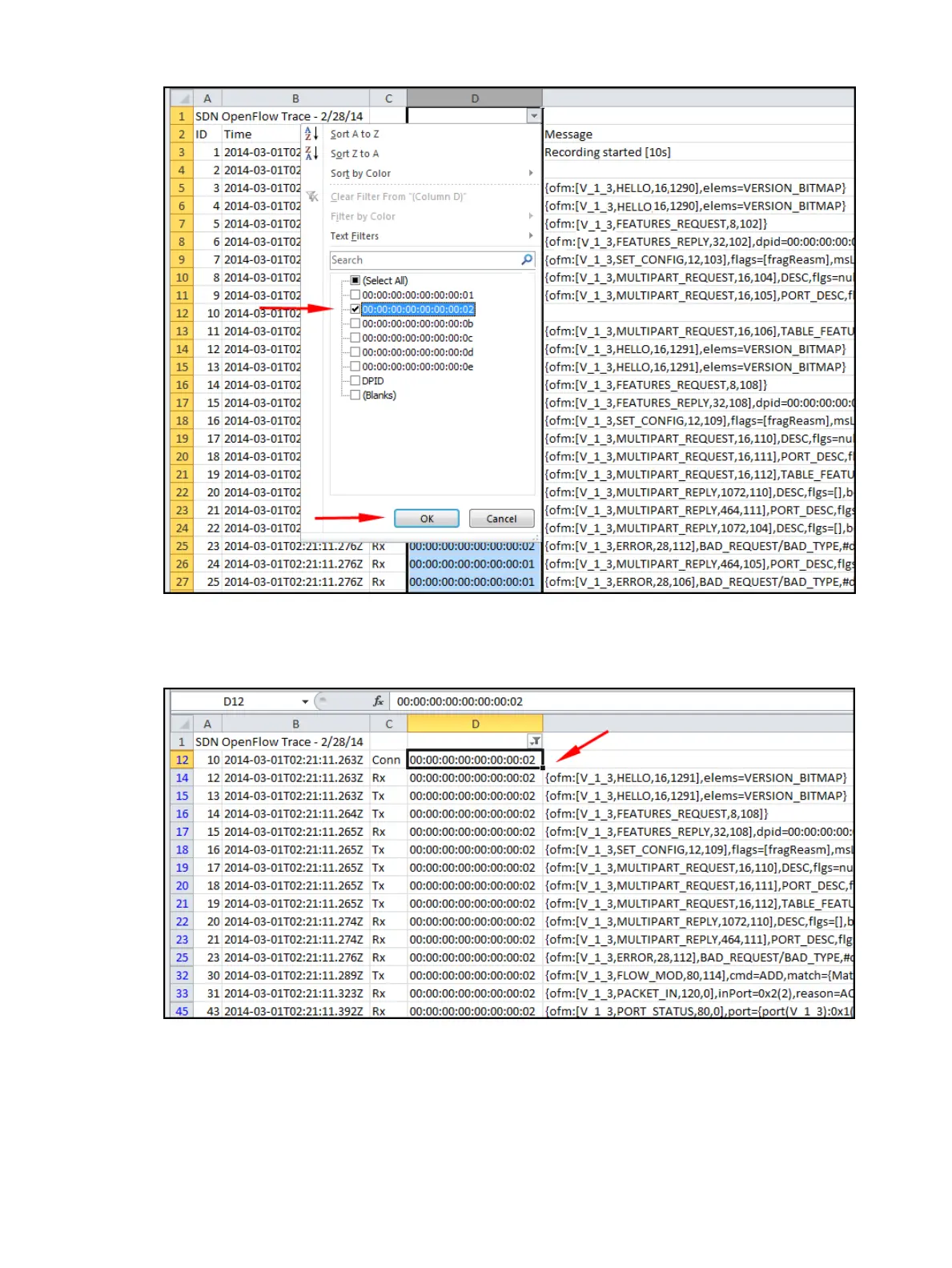 5. In the resulting display, only the data filtered to data path 00:00:00:00:00:00:00:02 appears.