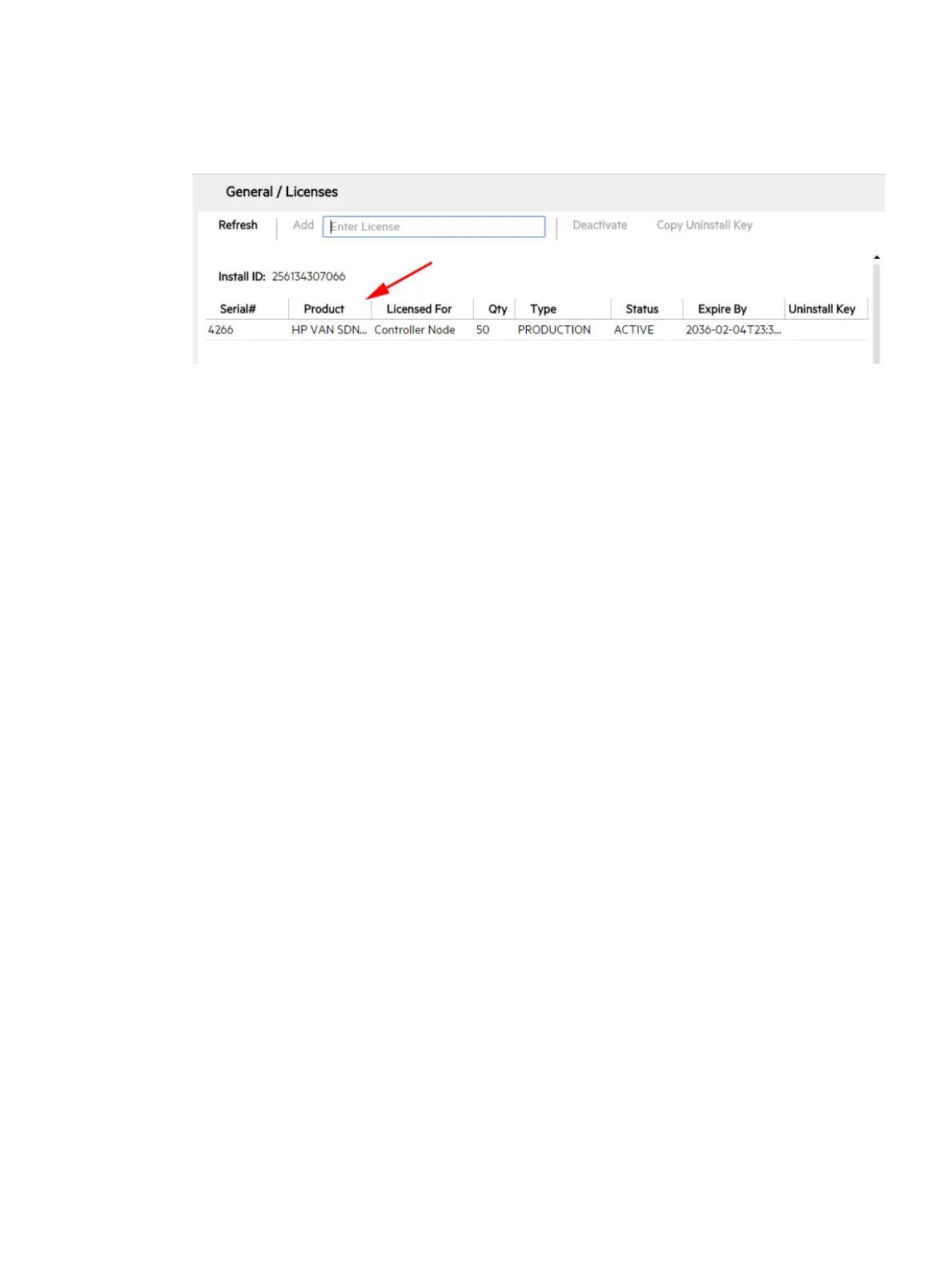 The active license is displayed in the table, below the Install ID, and the Add button is no