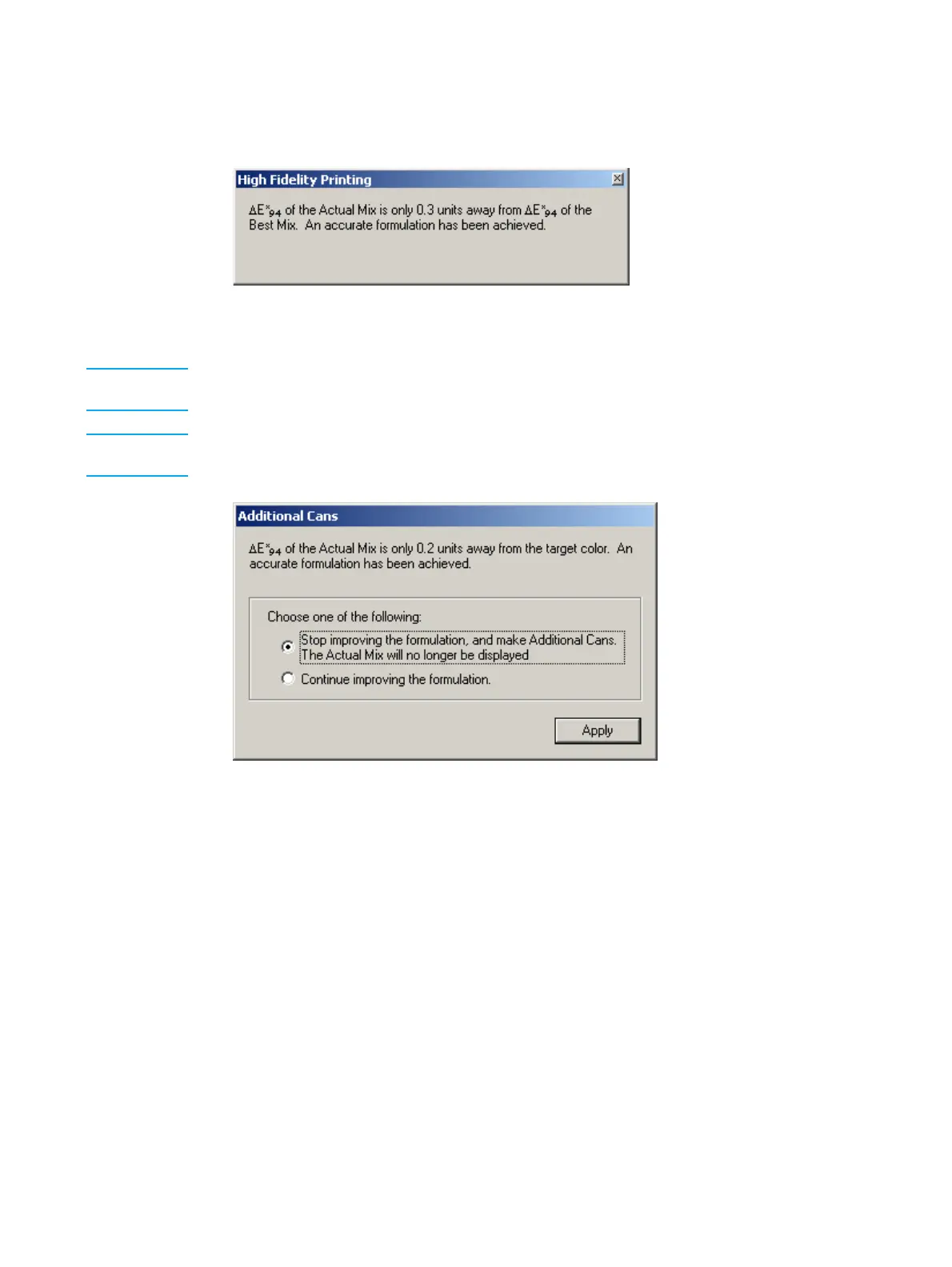 Note When the difference between the colors is less than1.0, the Additional cans window appears