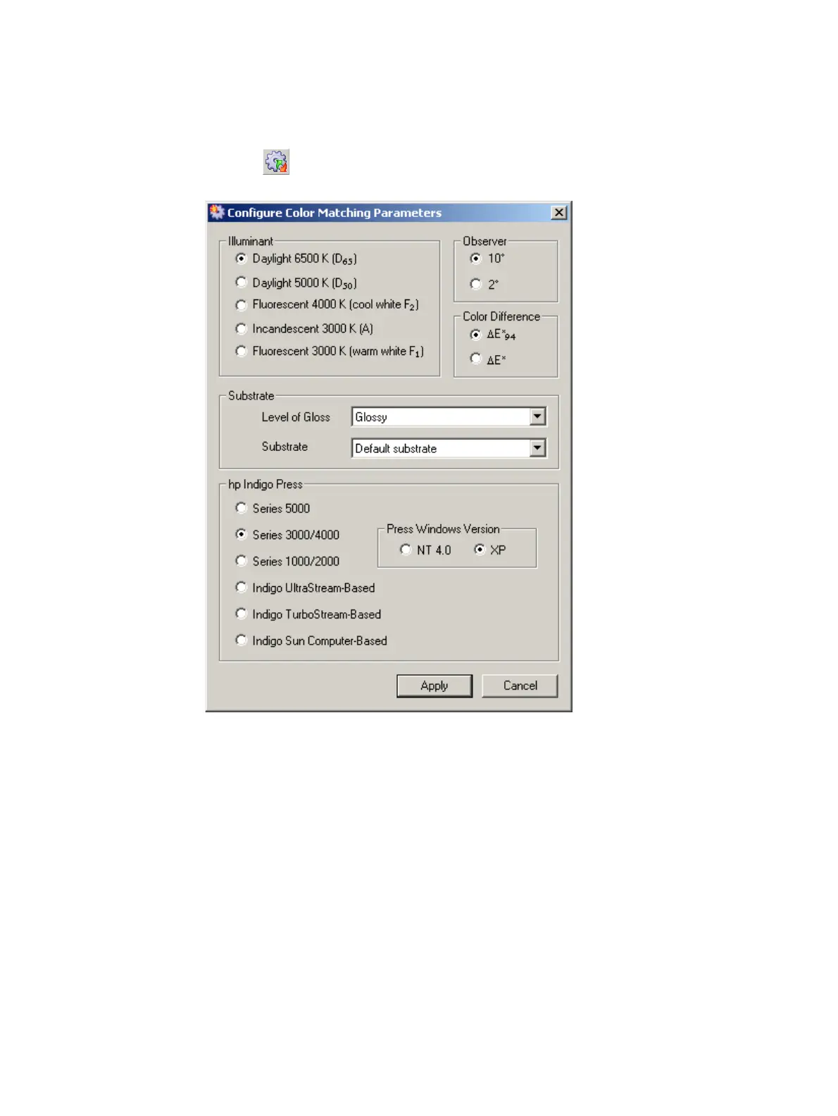 Options relating to the following color matching parameters can be set from this window: