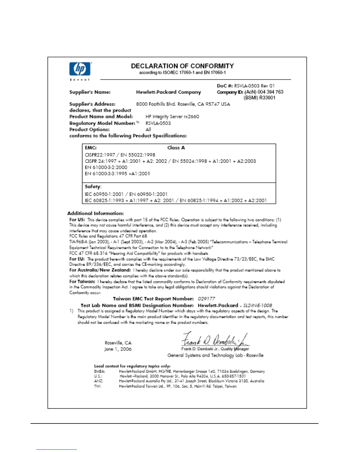 HP Integrity rx2660 Server Safety and Regulatory Information