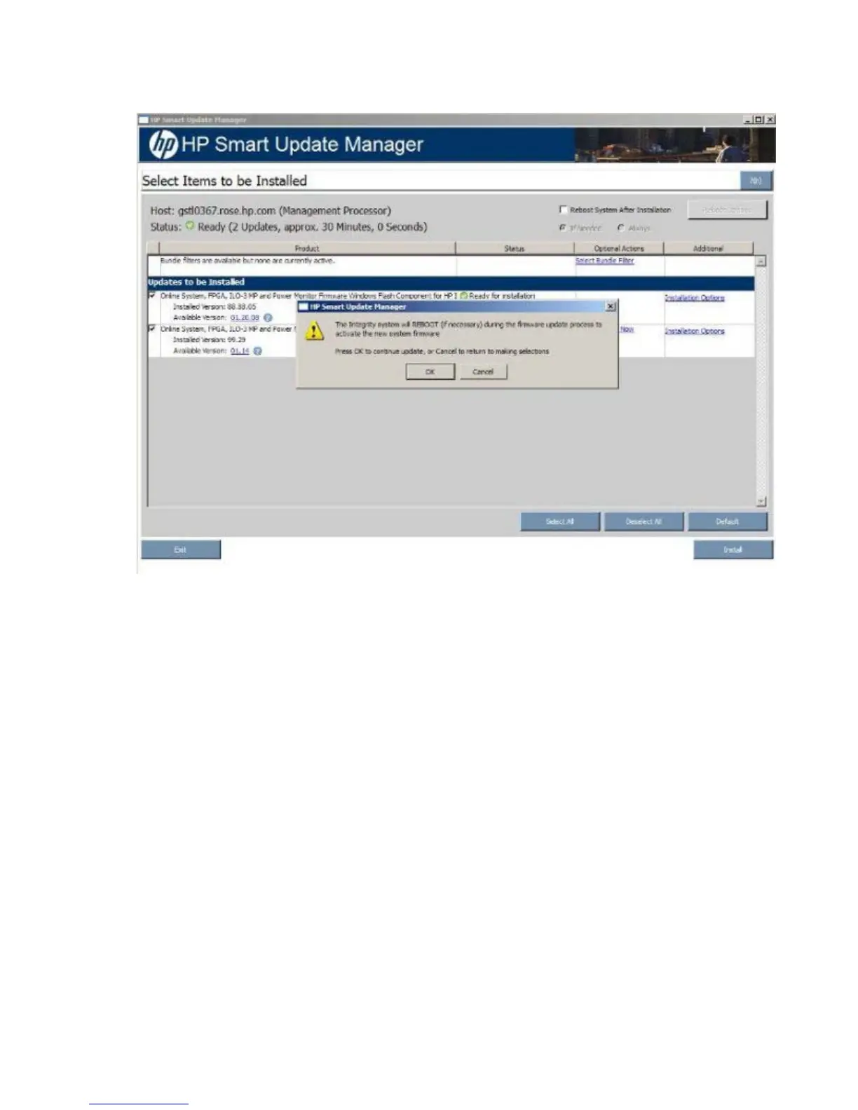 displays, indicating that HP SUM will reboot the server during the firmware update process.