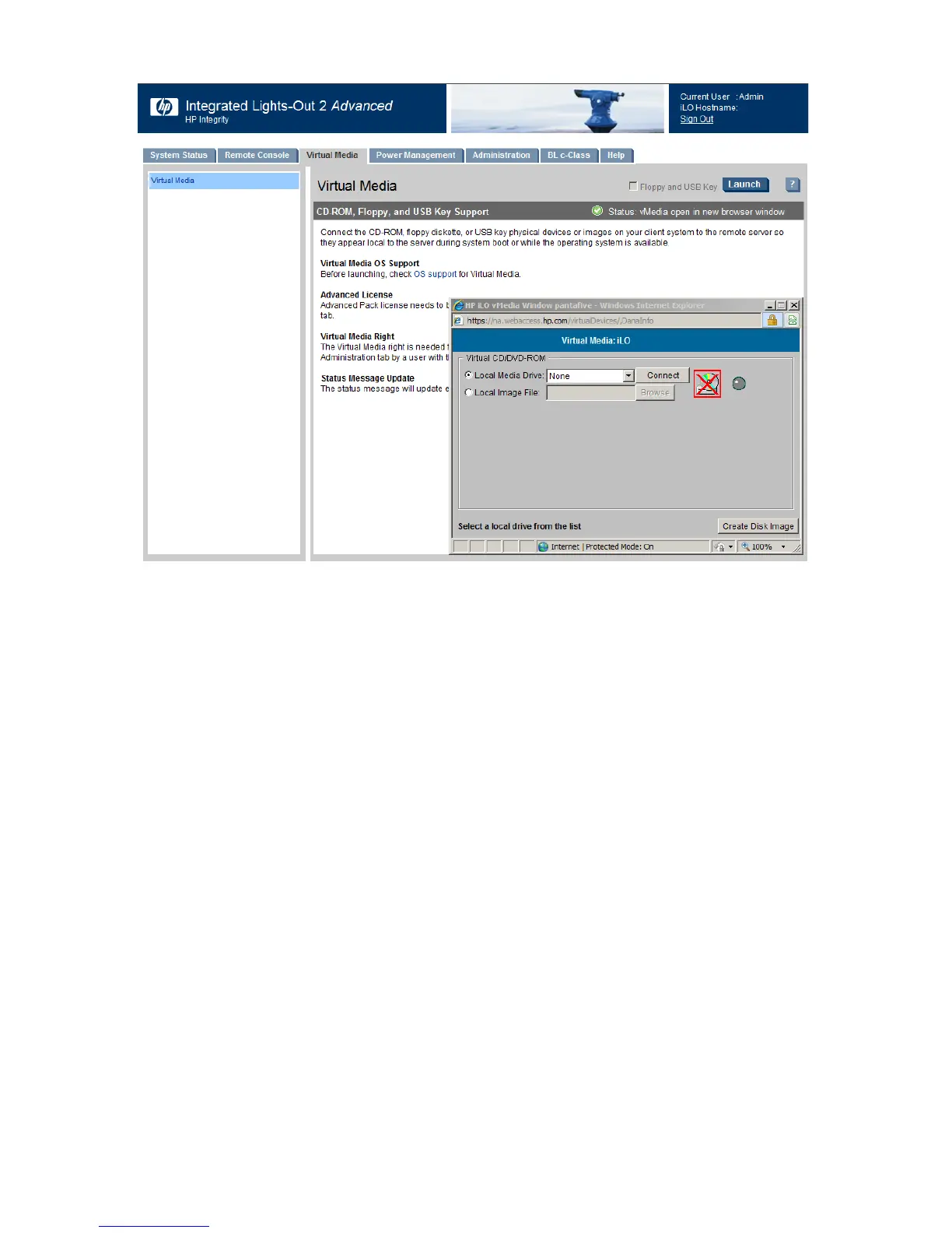 Figure 2-1 Configuring virtual media using the iLO interface