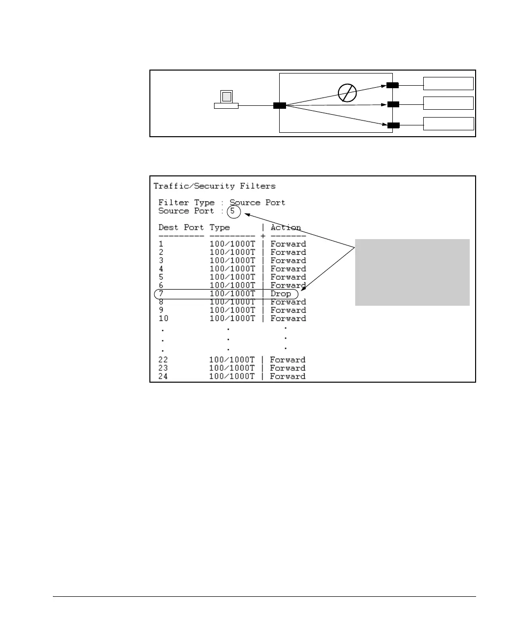 Figure 12-2. Example of a Filter Blocking Traffic only from Port 5 to Server "A"