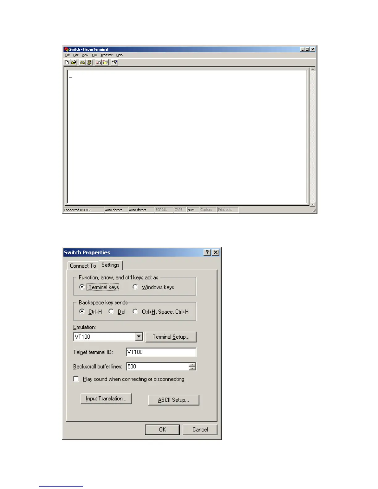 6. On the Settings tab, set the emulation to VT100 and click OK.