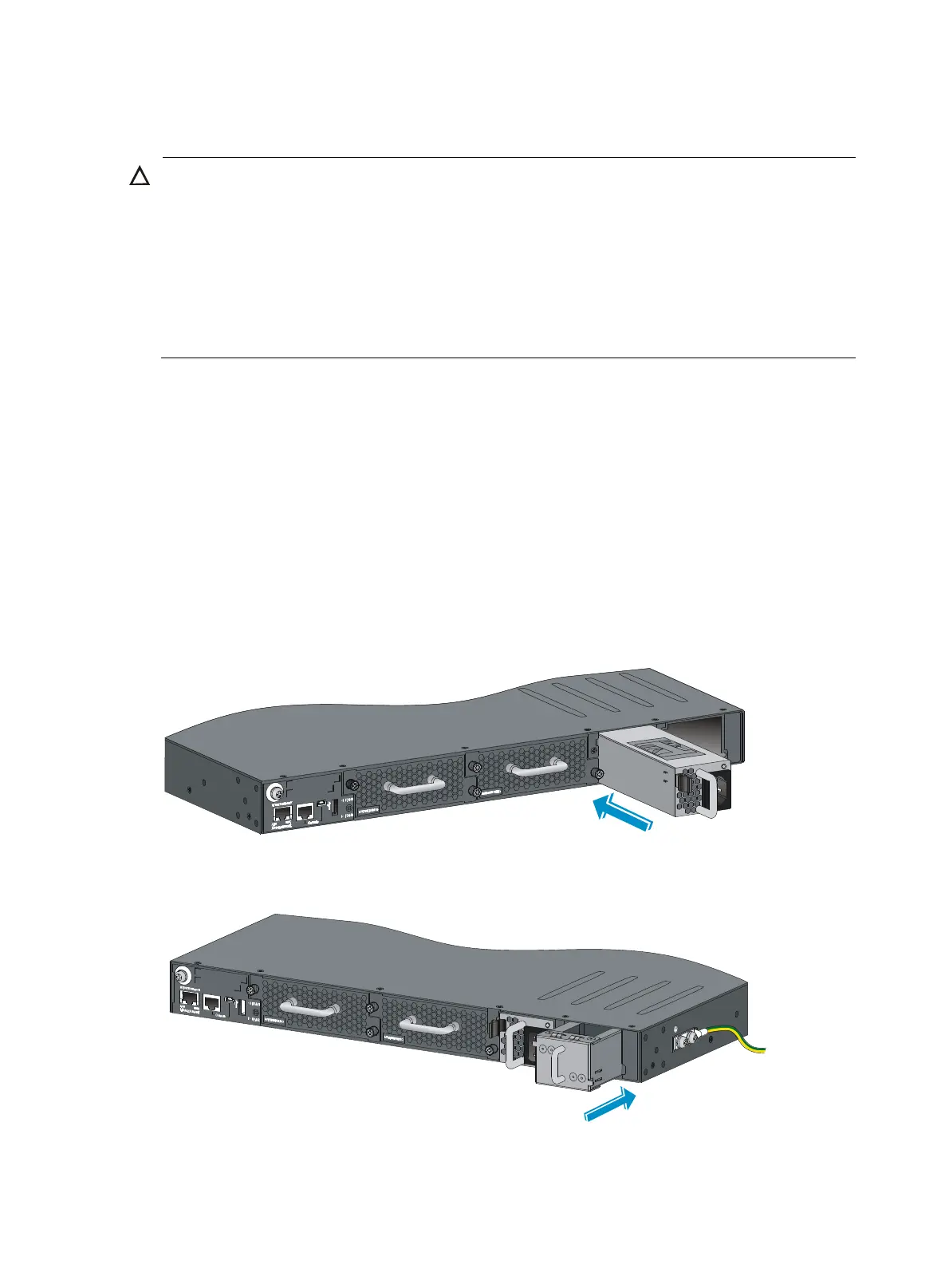 • Follow the forward inertia of the power supply when inserting it into the chassis, and make sure the